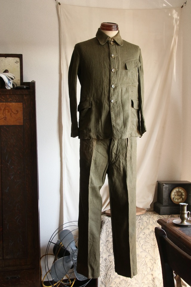 戦中を描いたドラマにも登場する国民服のセットアップ。麻で作られており、湿気の多い真夏でもサラリと快適にお召しいただけます。 ジャケットにある片胸のポケットや、パンツに備えられた丸みのあるウォッチポケットなど、量産型にはないツウ好みな仕様も見逃せません。 ーーーーーーーーーー サイズ: 肩幅およそ 42cm 袖丈およそ 53cm 着丈およそ 63cm パンツ ウエストおよそ42cm 総丈およそ84cm 股下およそ62cm こちらの商品は古いものです。 経年によるキズ、汚れ等がございます。 ご理解いただきご検討くださいませ。 商品画像と実際の色味には多少の違いがある場合がございます。 風合いとともにお愉しみいただけますと幸いです。 ご質問等ございましたら お気軽にお問い合わせください。 東京都公安委員会 古物商許可第308832320283号