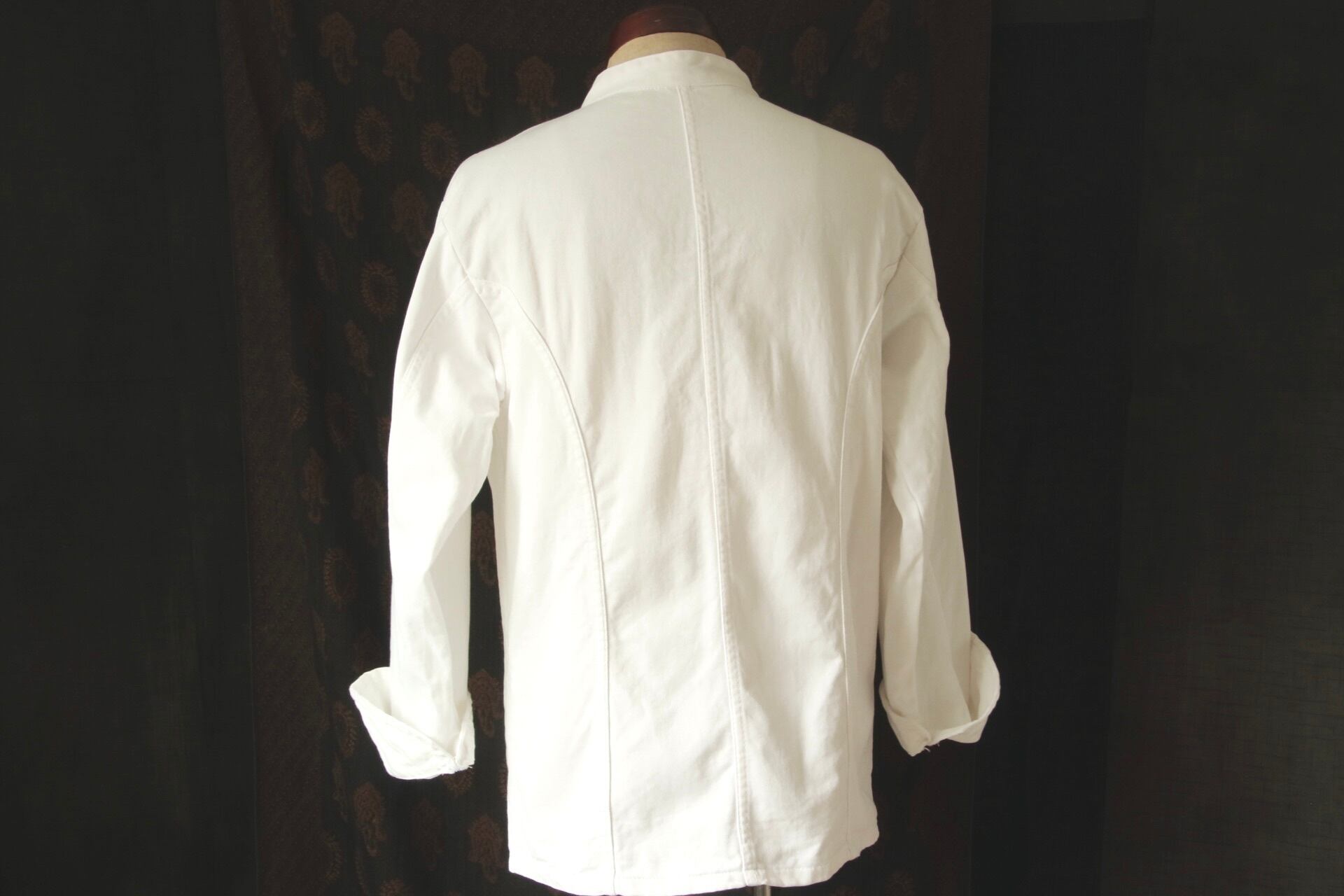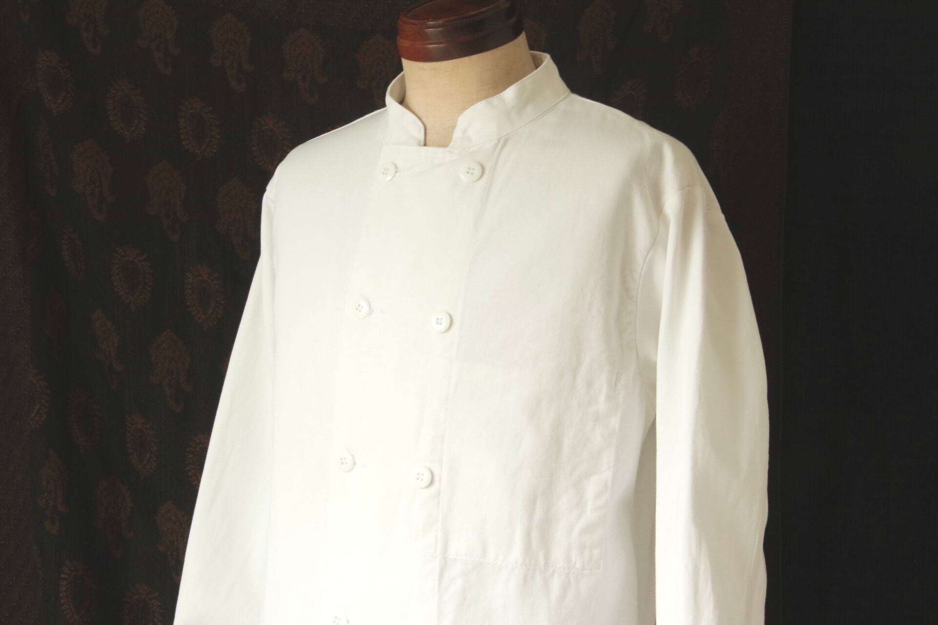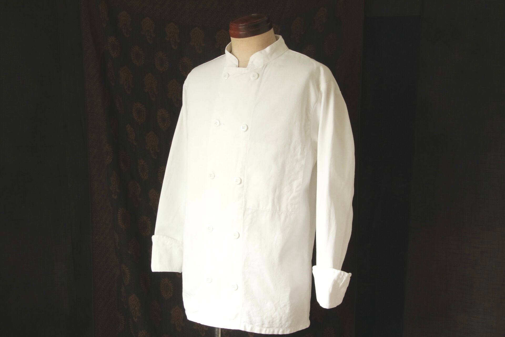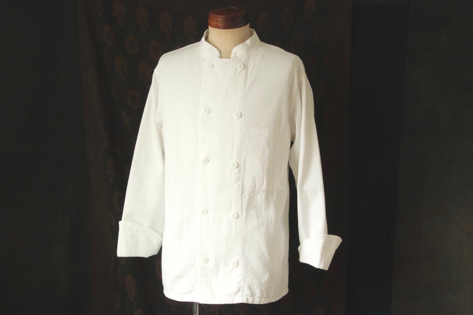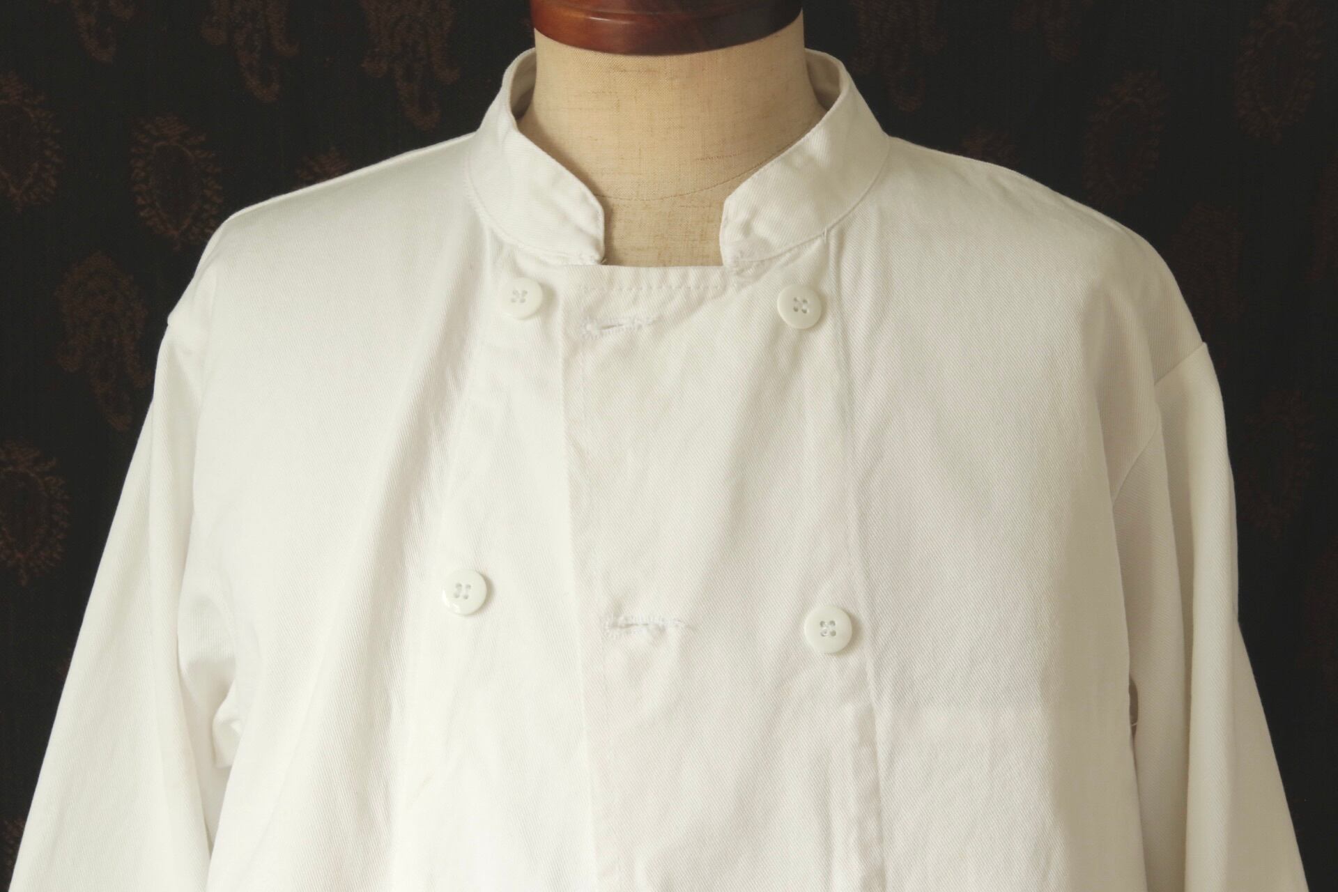 ヨーロッパもののシェフジャケット。年代は浅いですが、抉りの効いた背面パターンにヴィンテージへの敬愛が宿ります。