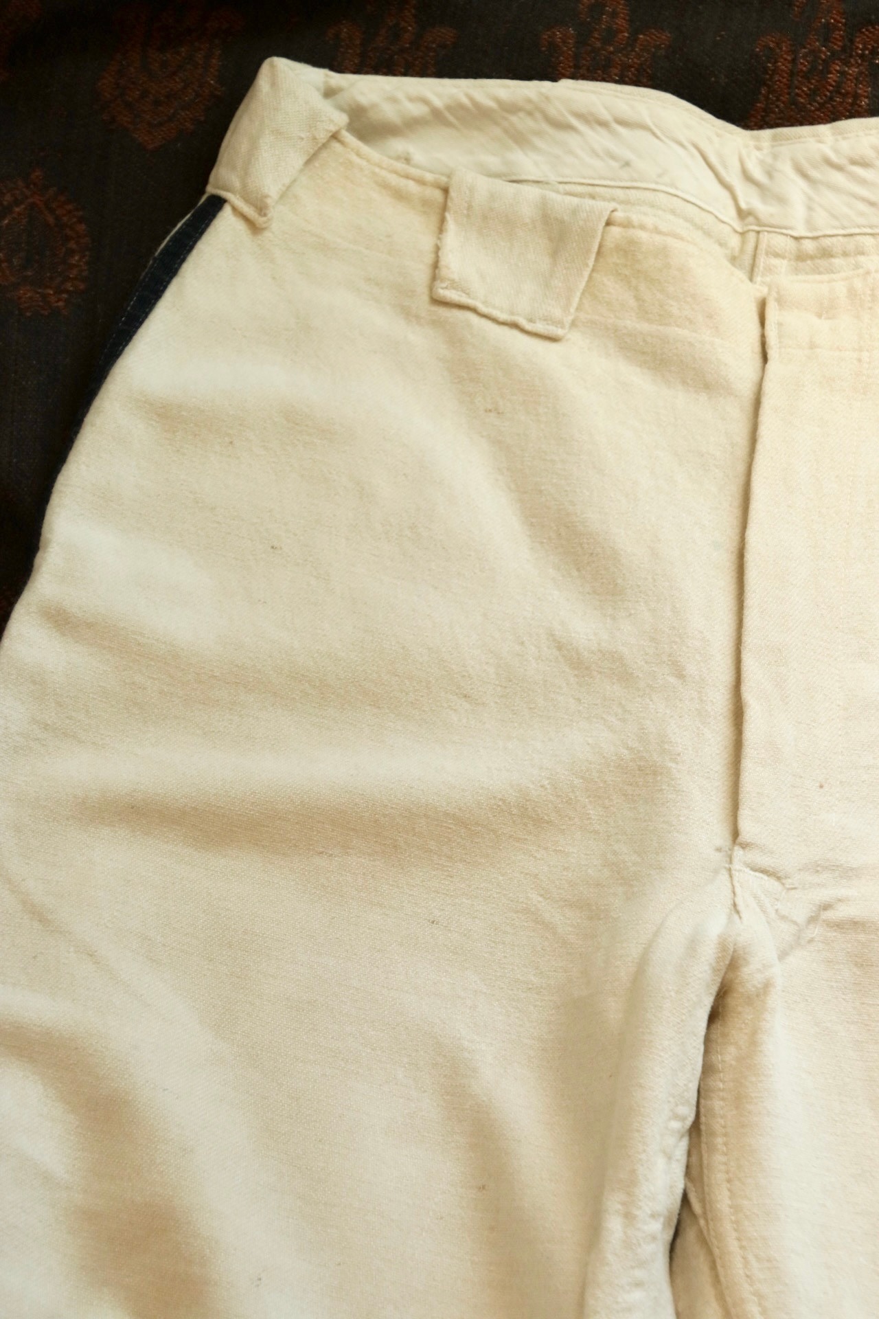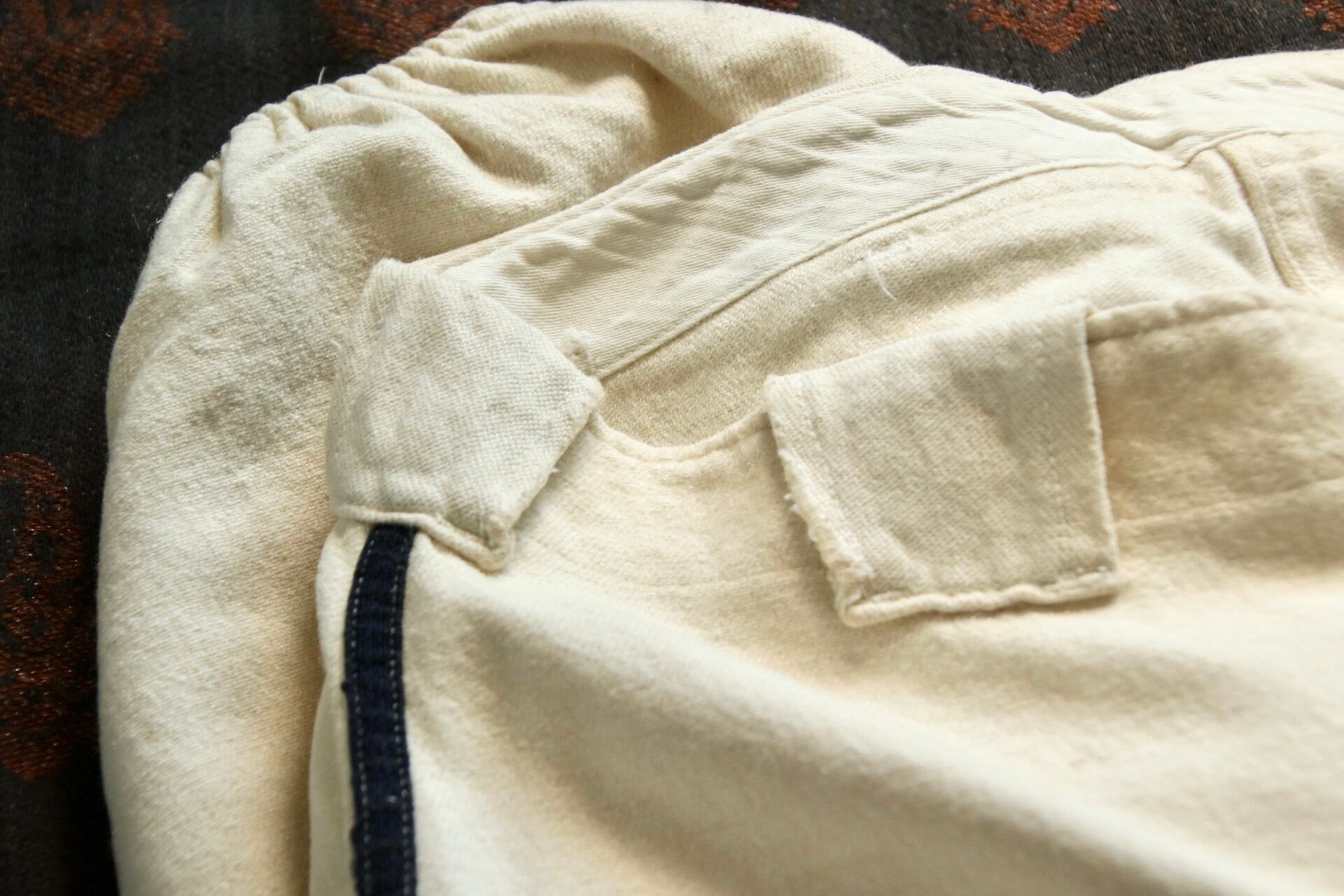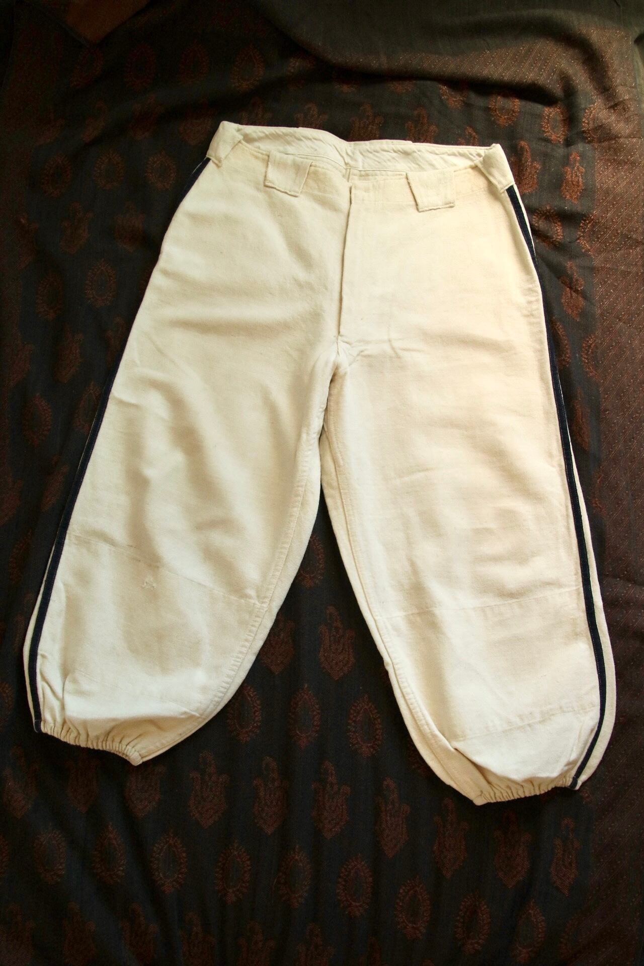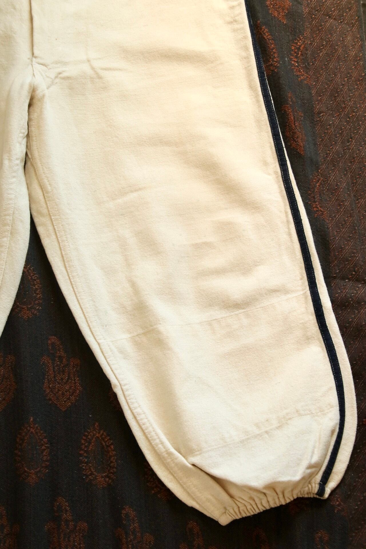 柔らかなウールの古いベースボールパンツ。黒の生地であてられたサイドラインが特徴的です。「NATIONAL」と刻まれたジッパーが採用されています。