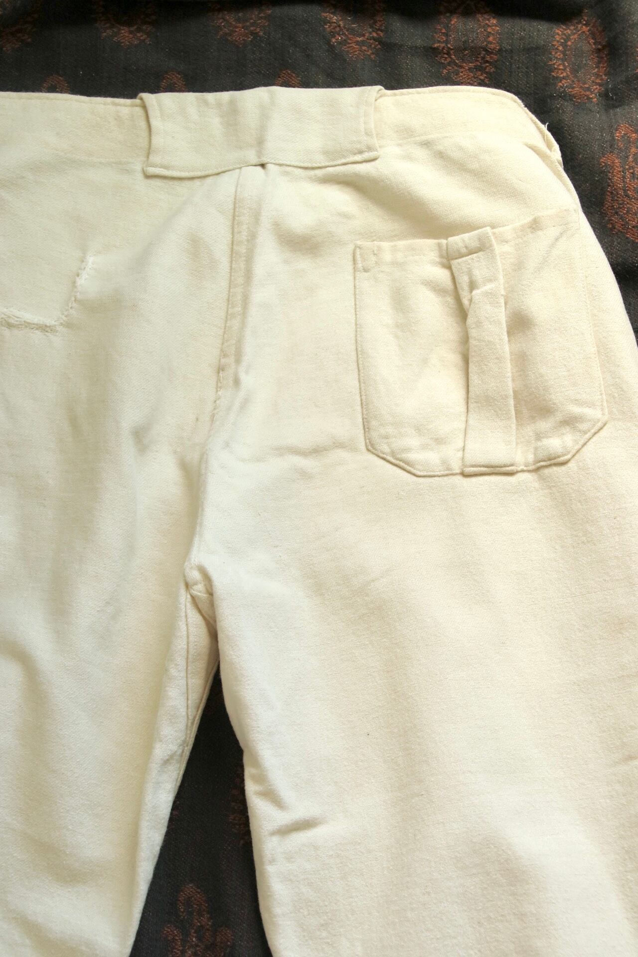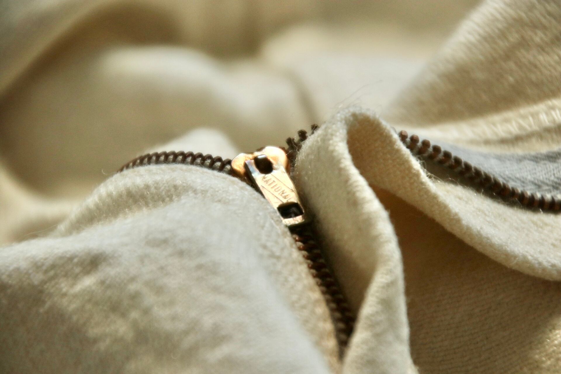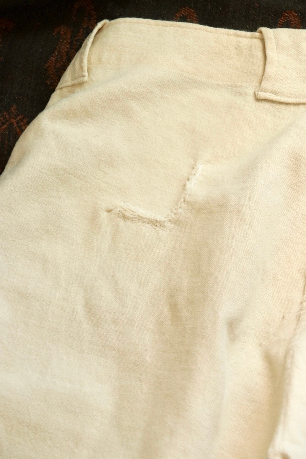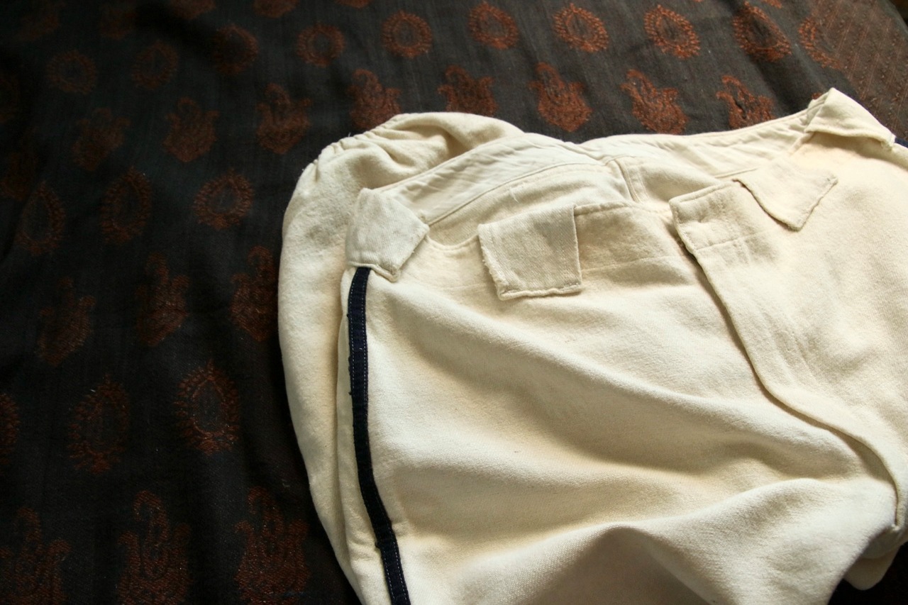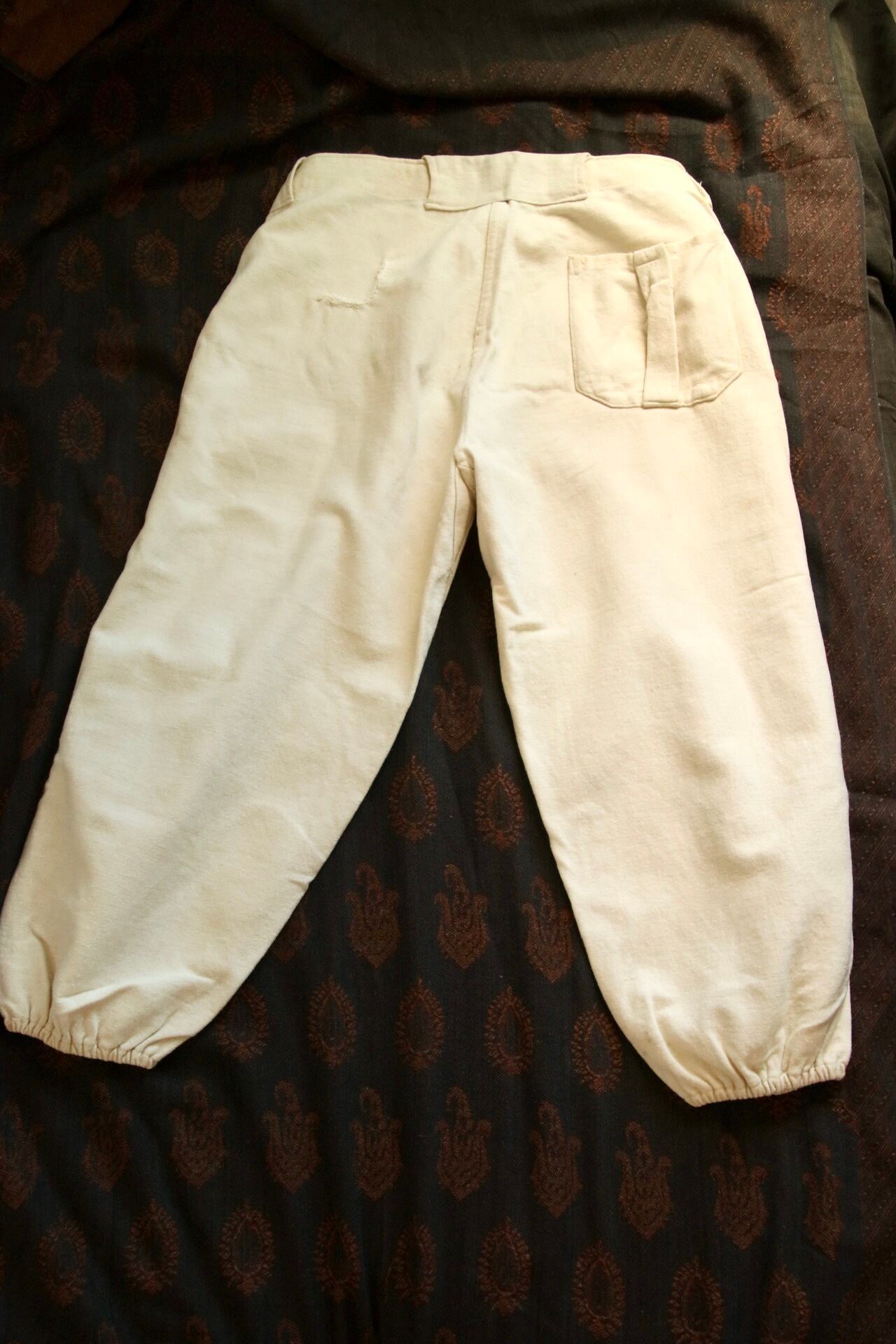 柔らかなウールの古いベースボールパンツ。黒の生地であてられたサイドラインが特徴的です。「NATIONAL」と刻まれたジッパーが採用されています。