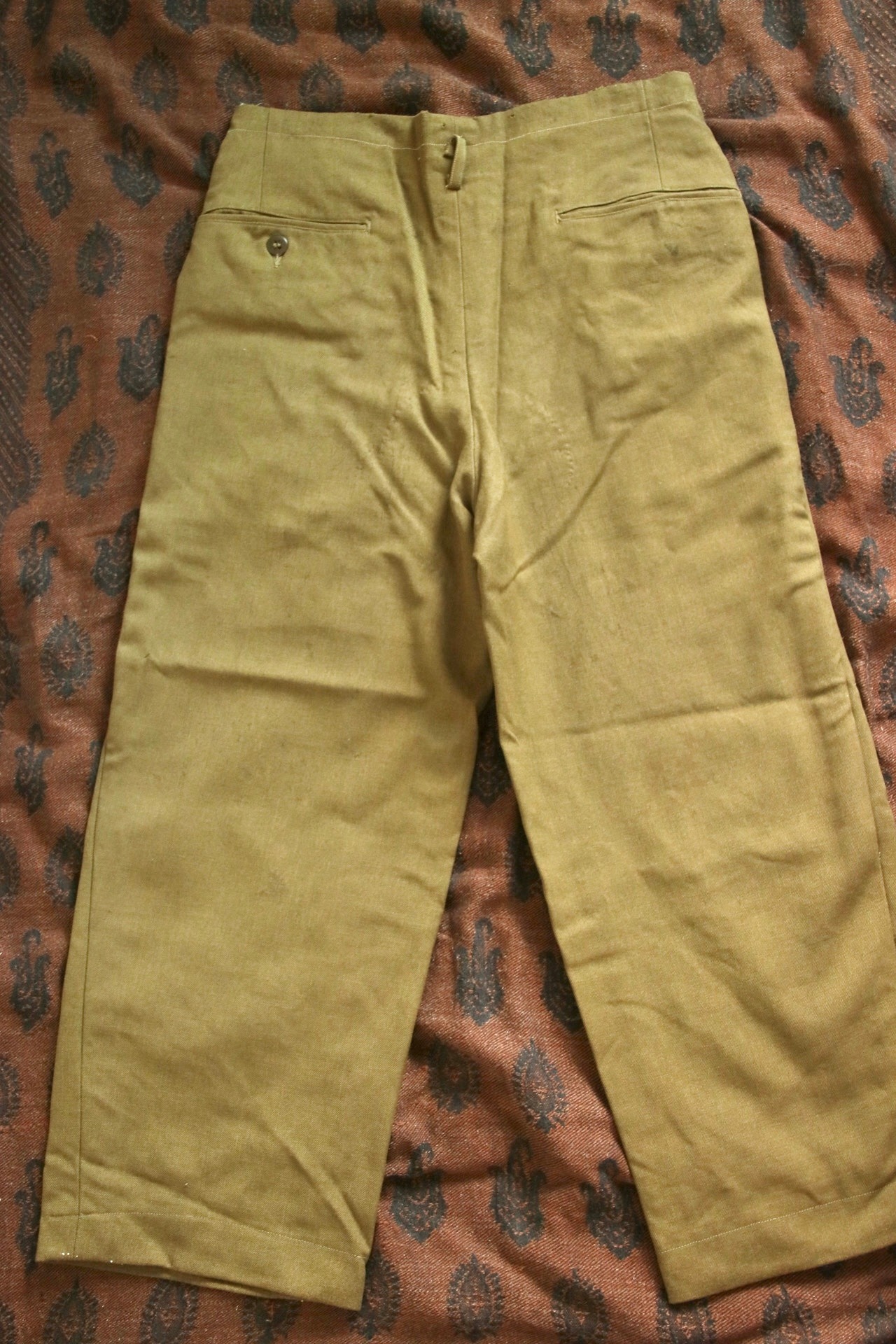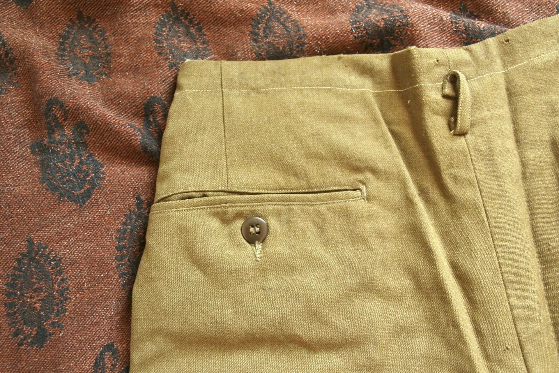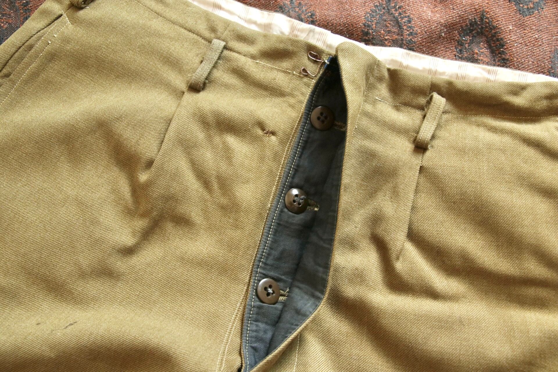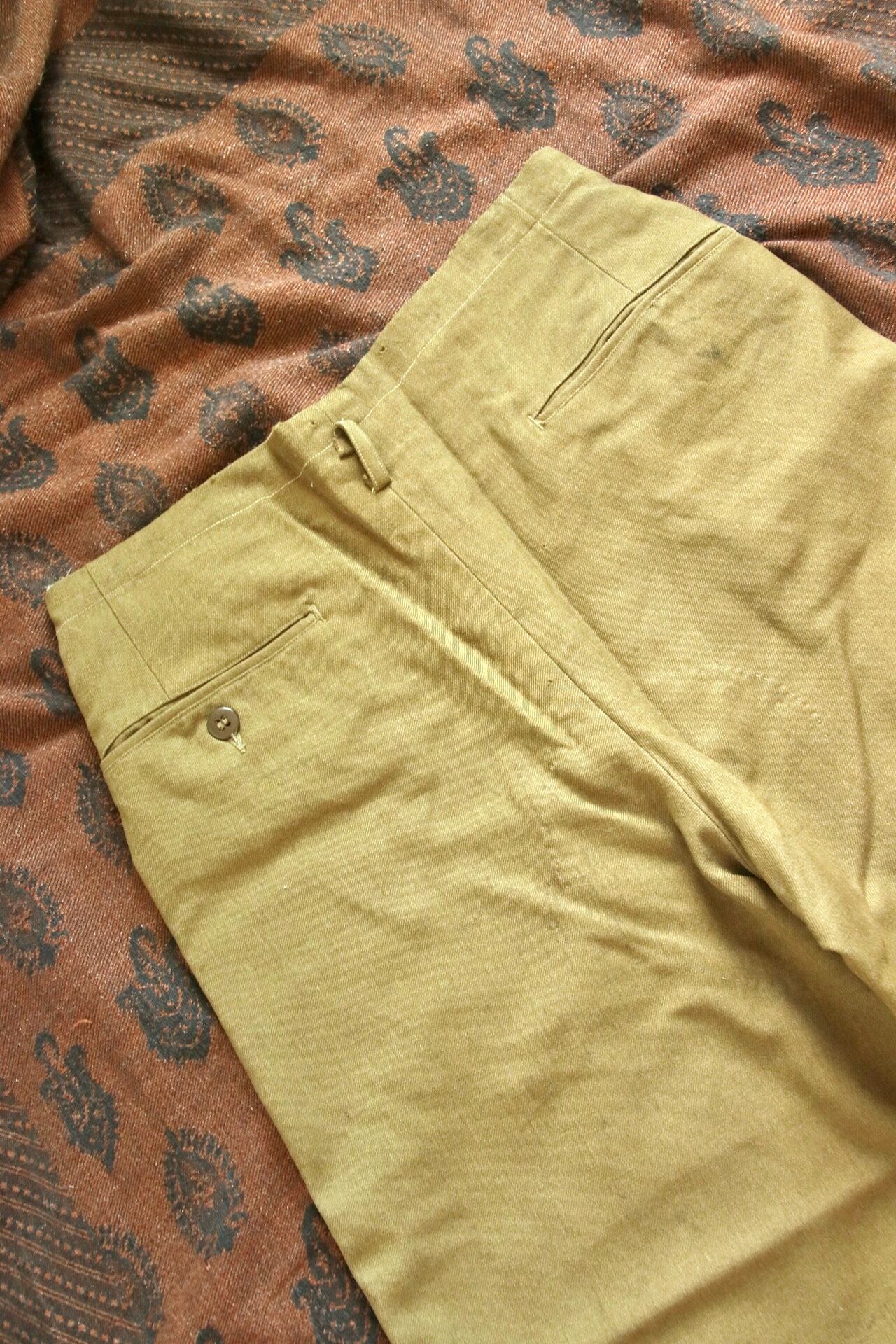 昭和初期のものと思われる独特なトラウザーズ。緑に少し黄色い糸が混ざったような豊かな色合い。もちっとした生地は触り心地よく、安心感があります。