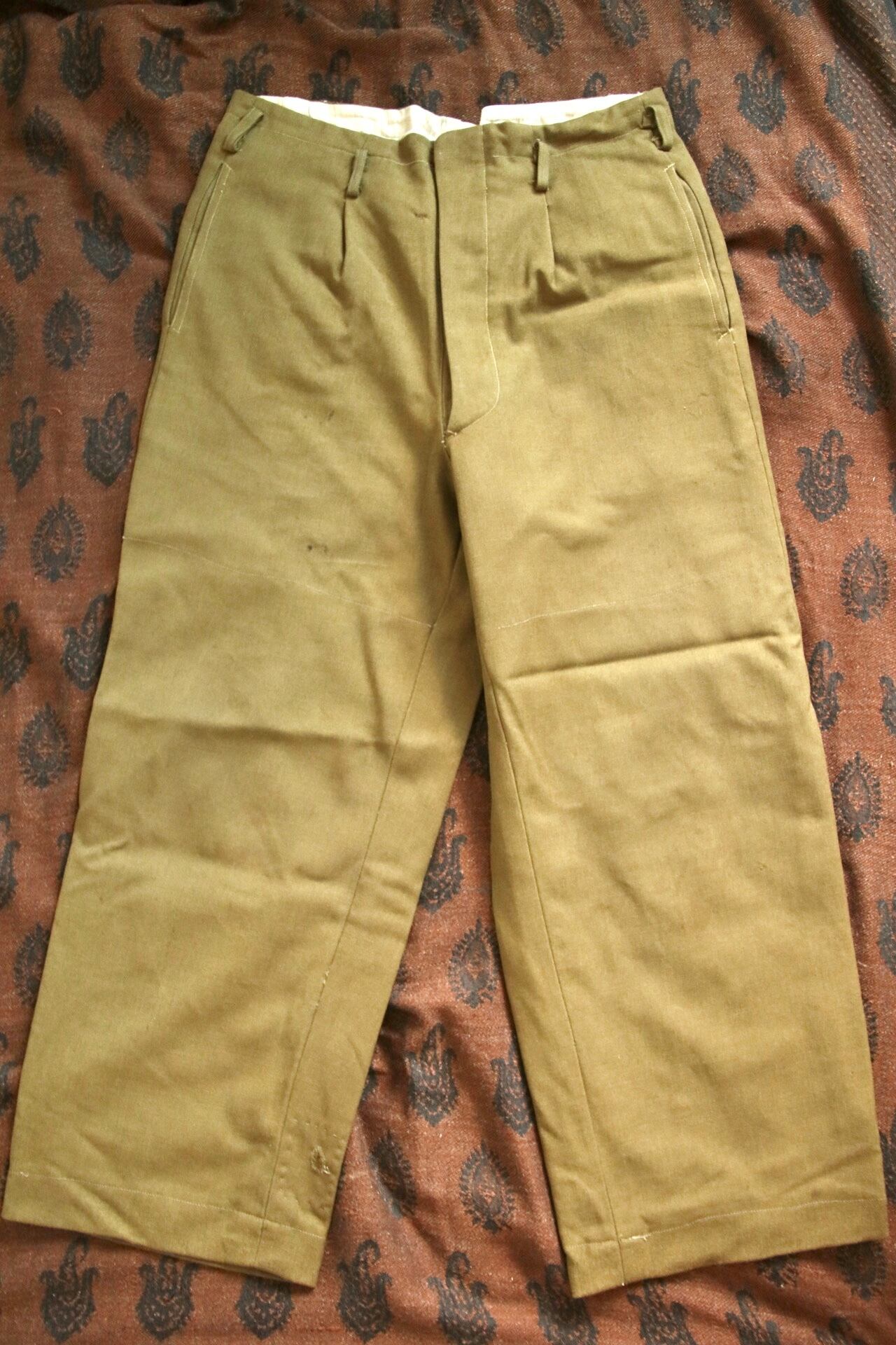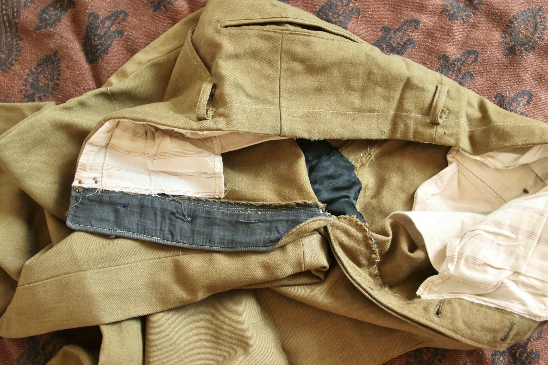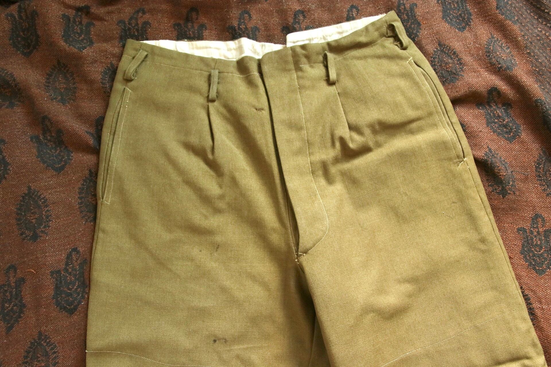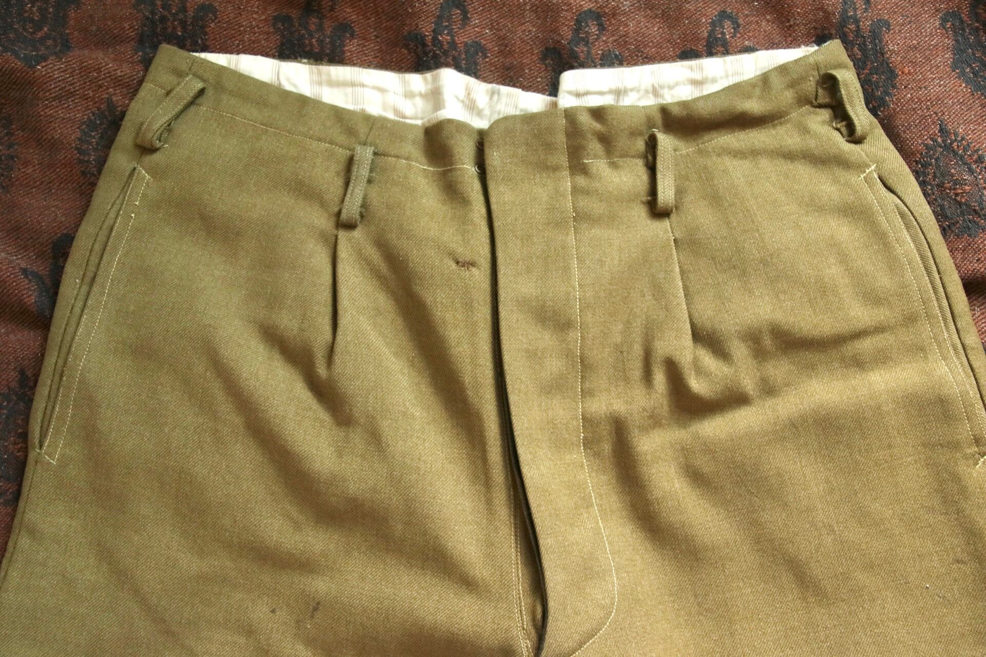 昭和初期のものと思われる独特なトラウザーズ。緑に少し黄色い糸が混ざったような豊かな色合い。もちっとした生地は触り心地よく、安心感があります。