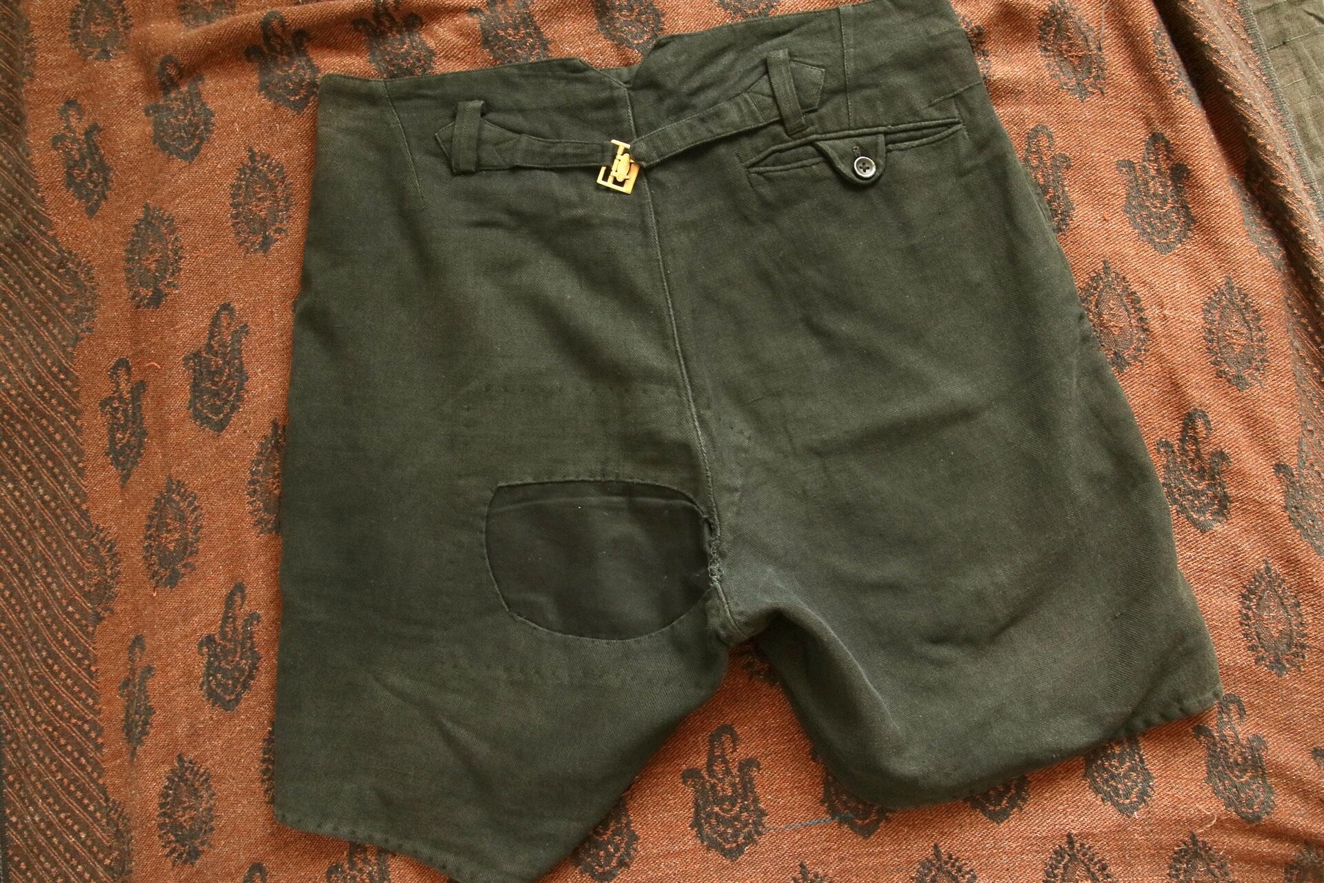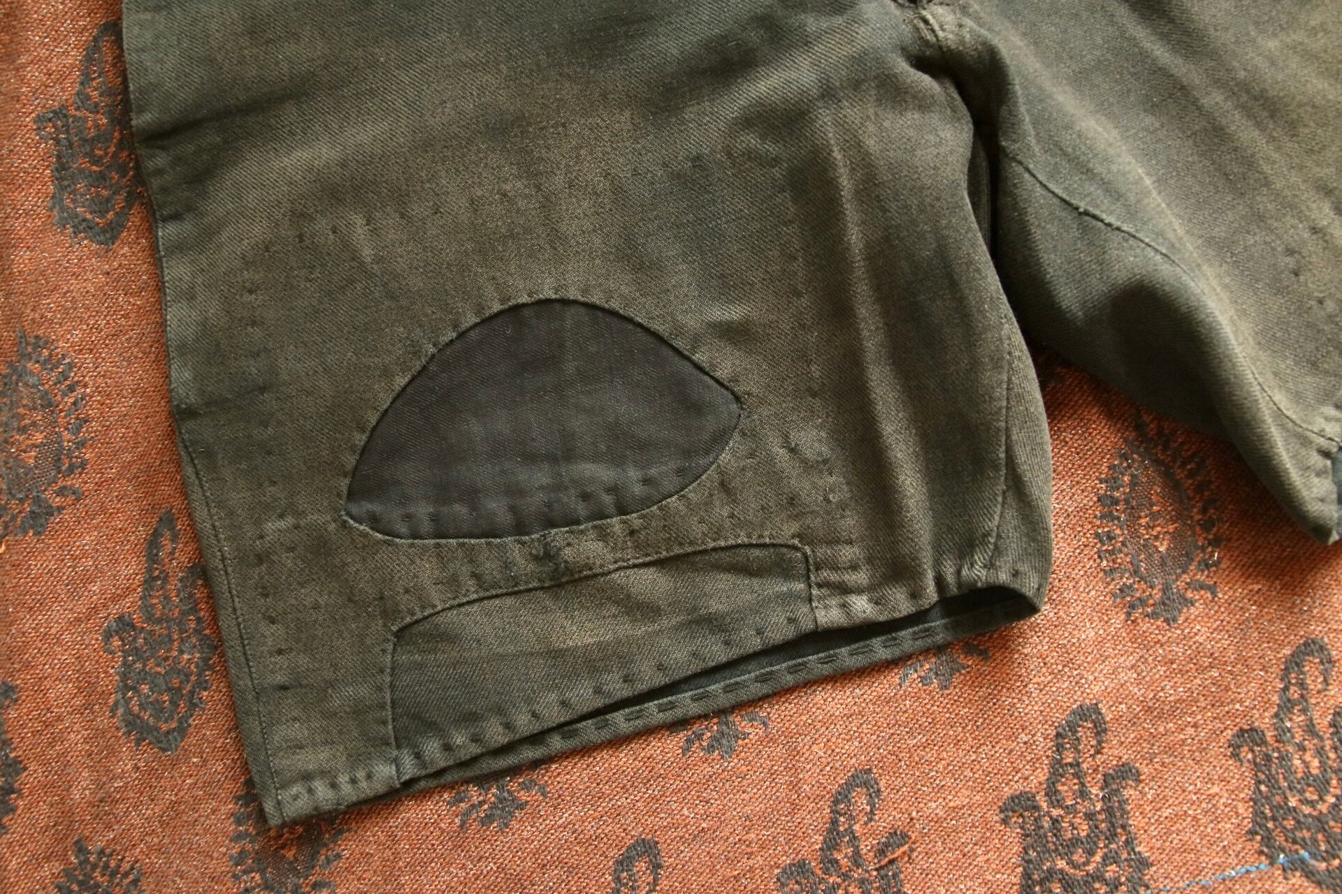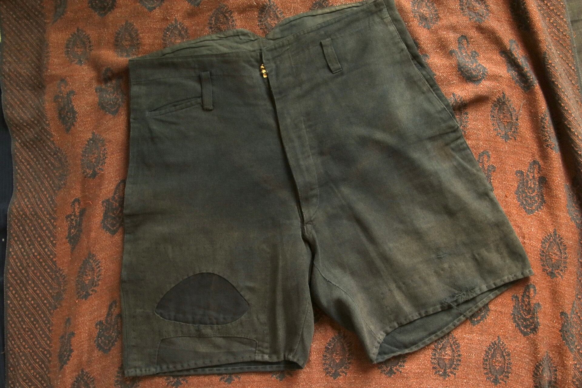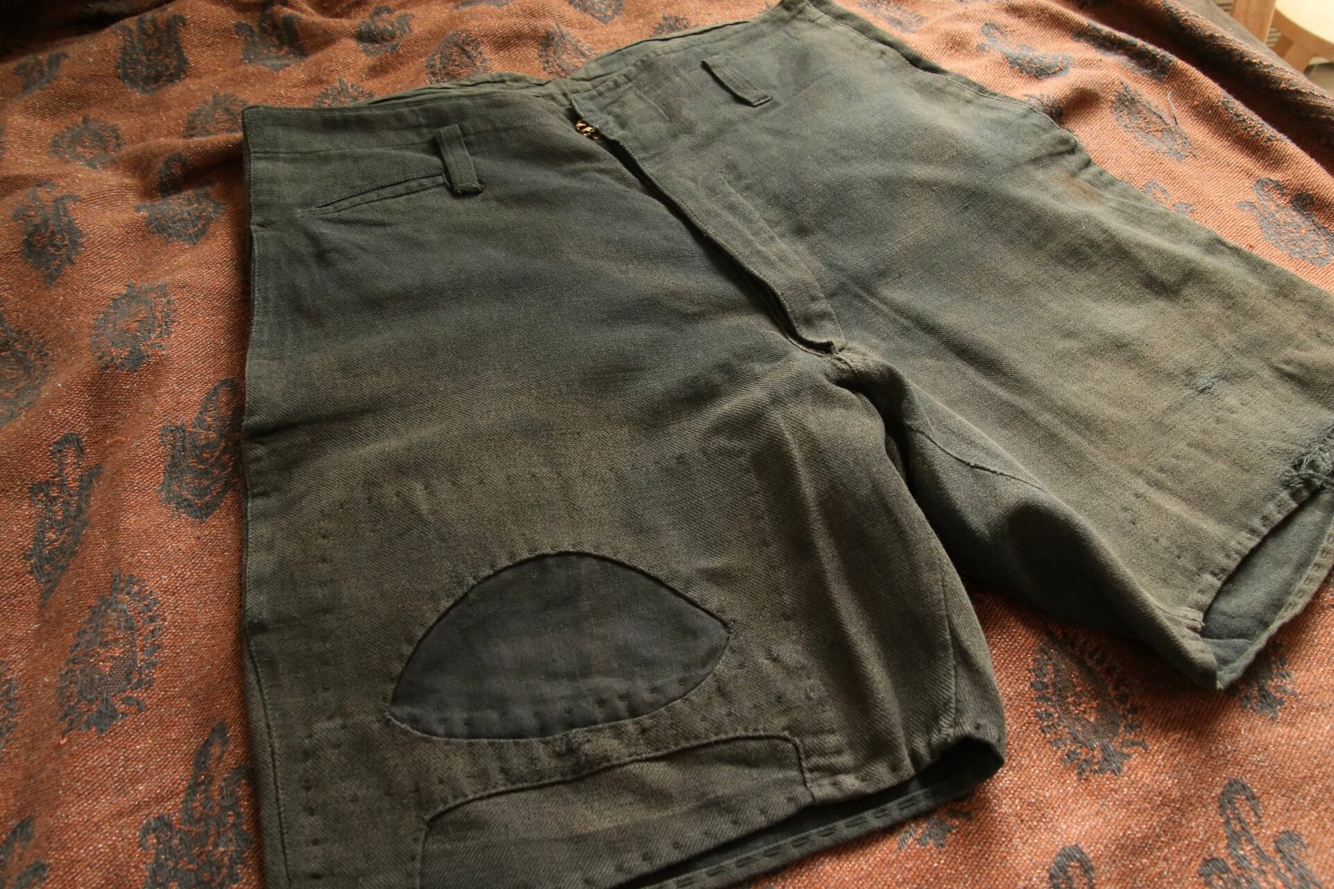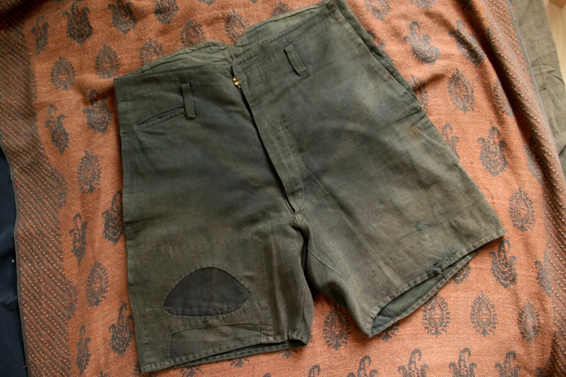 1920's〜1930'sと思われるヴィンテージハーフパンツ。染めが淡く深みのある色味に経年変化しています。パッチワークとコインポケット、さらに針式シンチバック付きのハーフパンツというコレクター仕様の逸品。