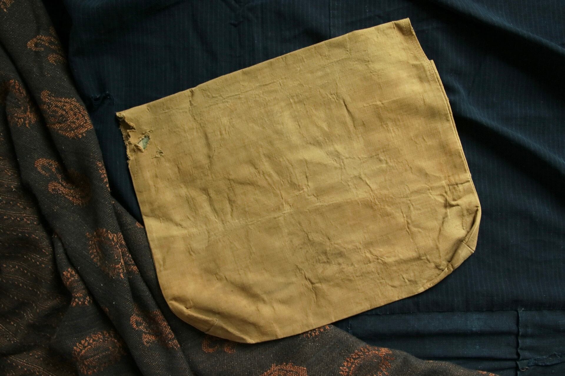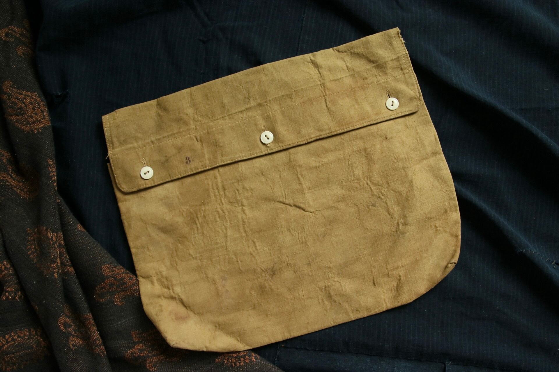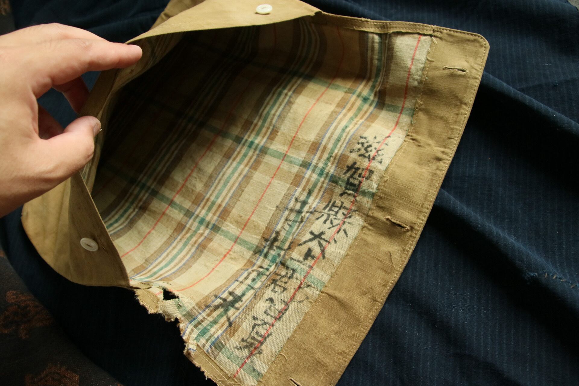 およそ100年前、大正期前後に作られたと思われるホームメイドのクラッチバッグ。滋賀県の家から出てきており、手書きの名が確認できます。