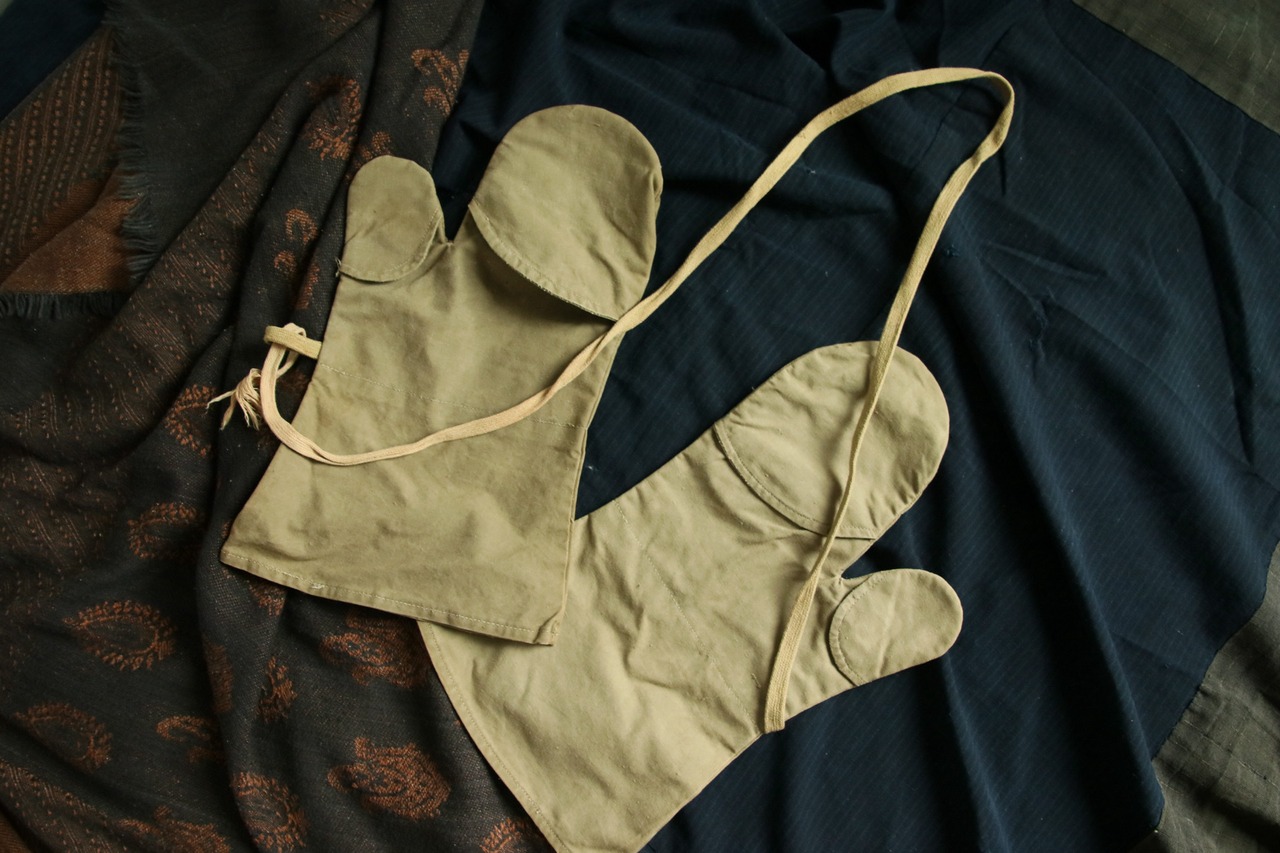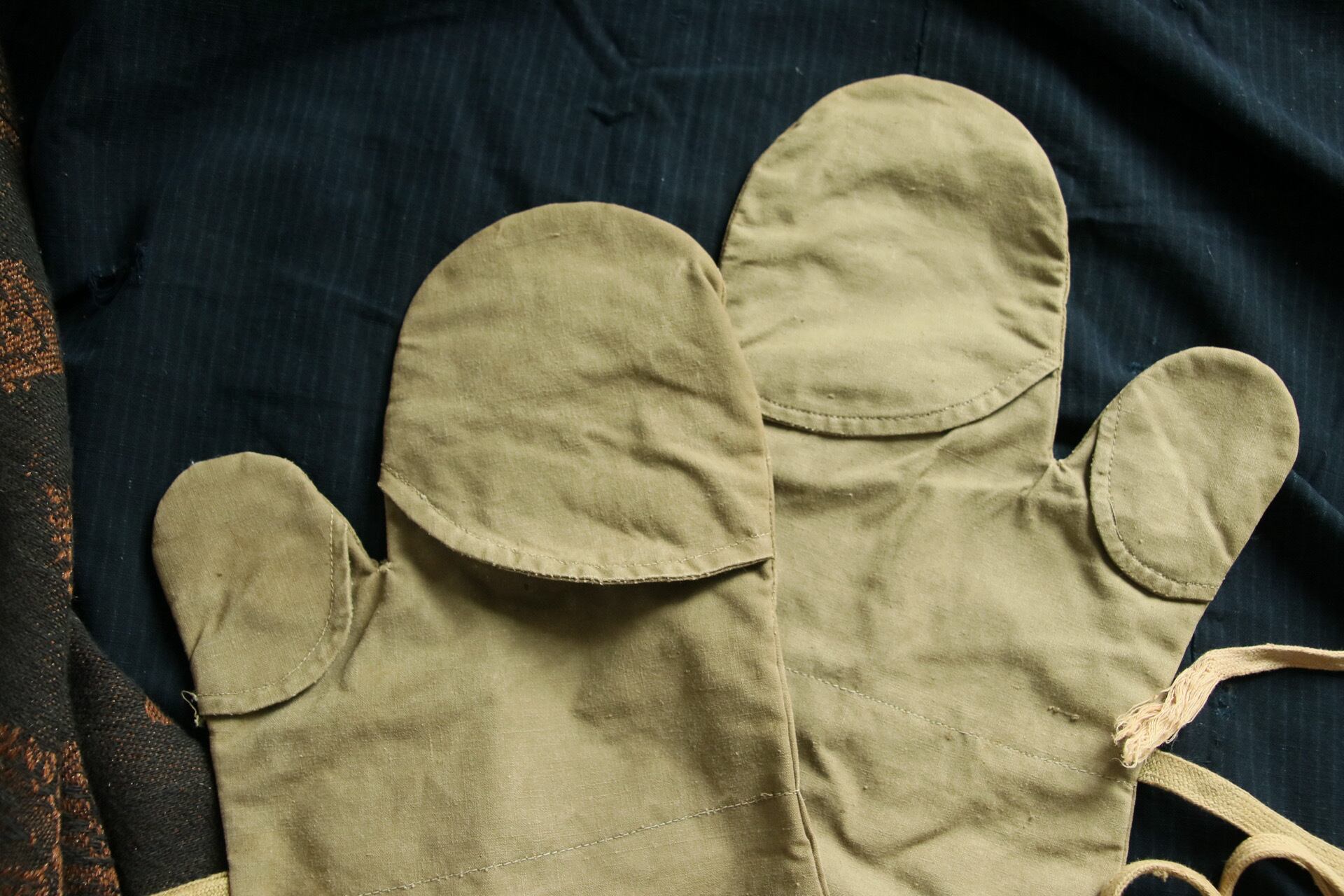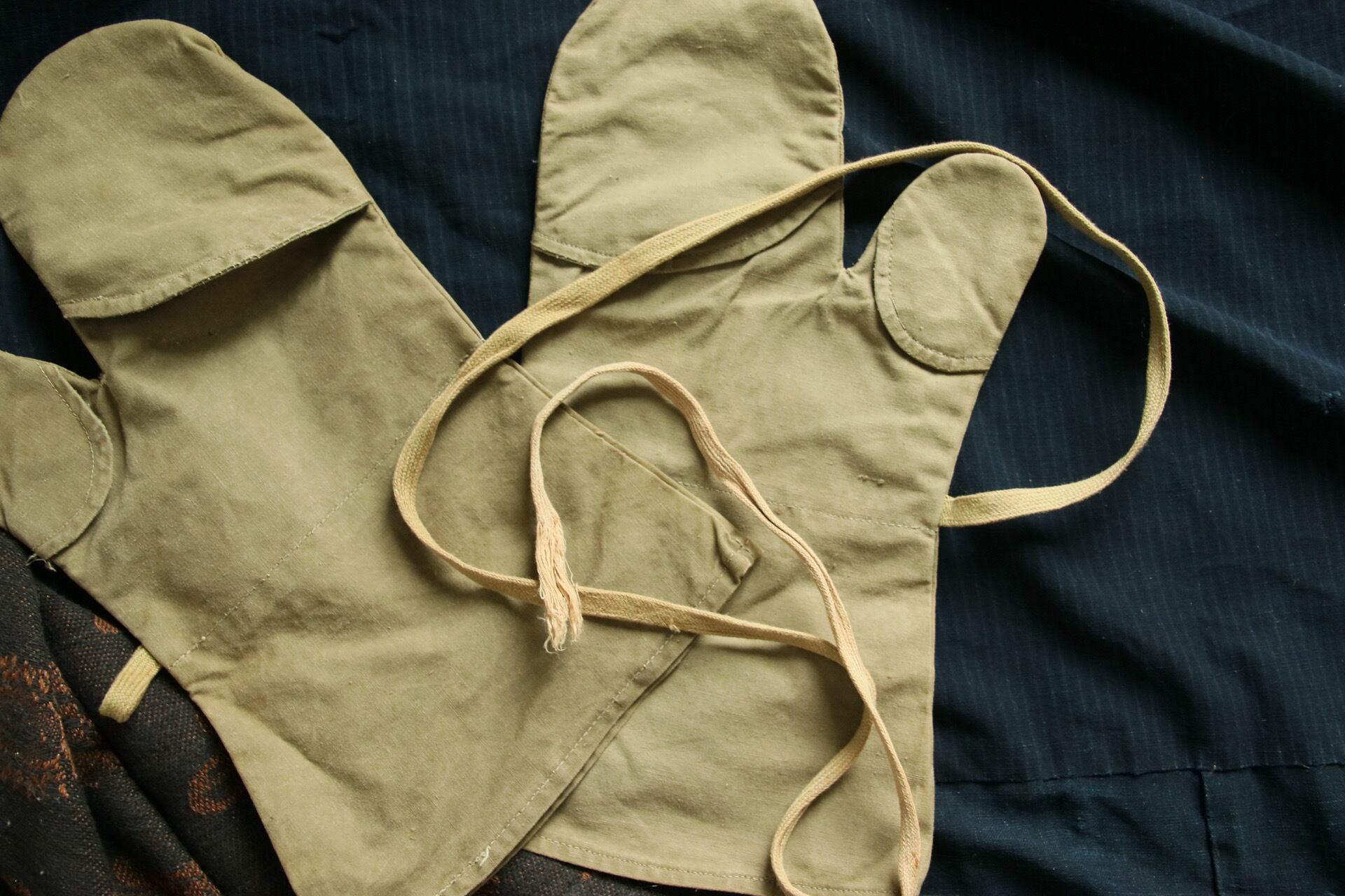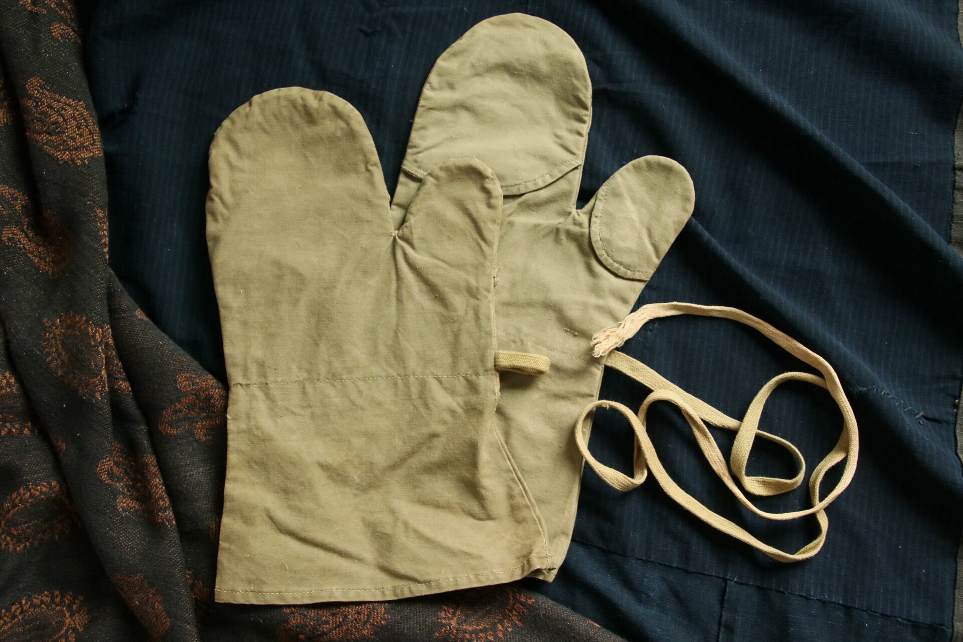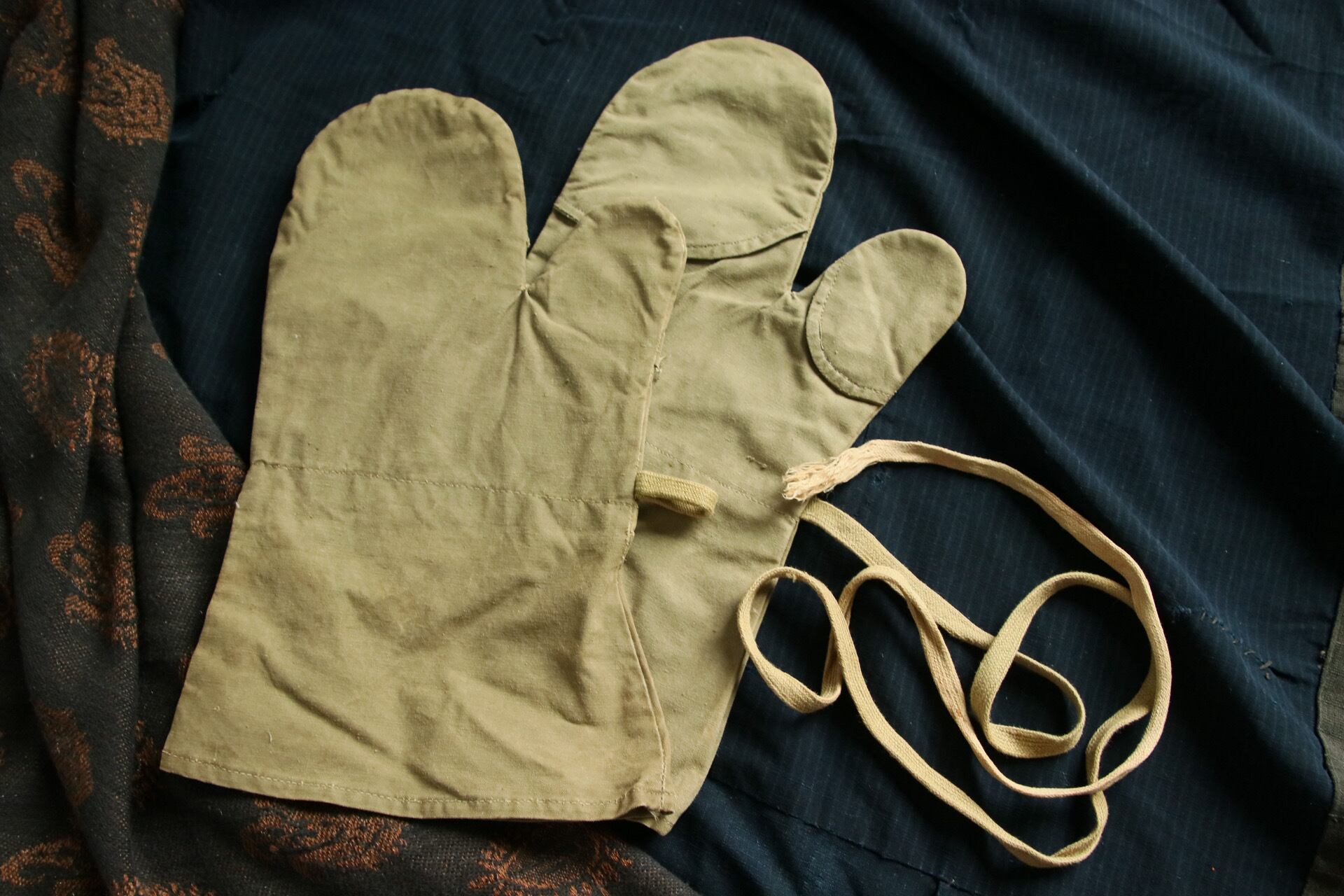備え付けの長い紐は、対になる手袋同士を結び、物資をたくさん担いで歩く兵隊でも、首から掛けて携帯できるようにするためだと考えられます。
