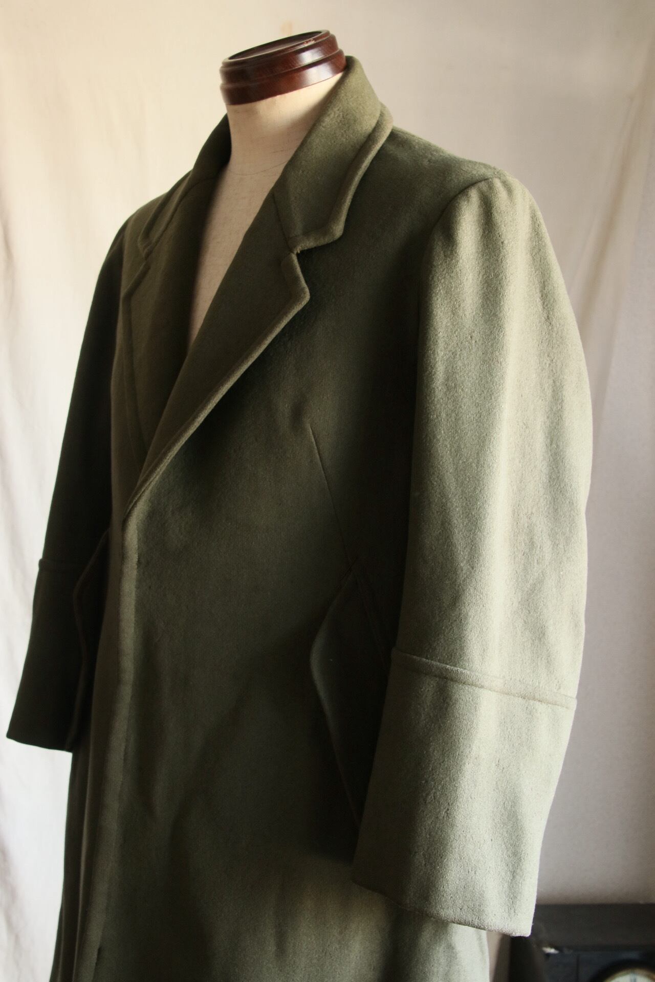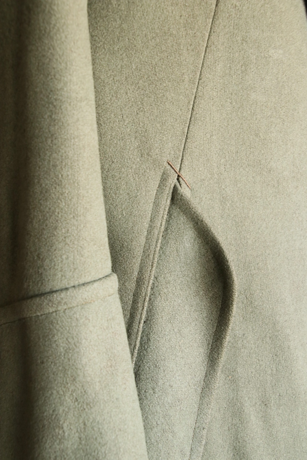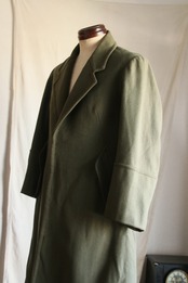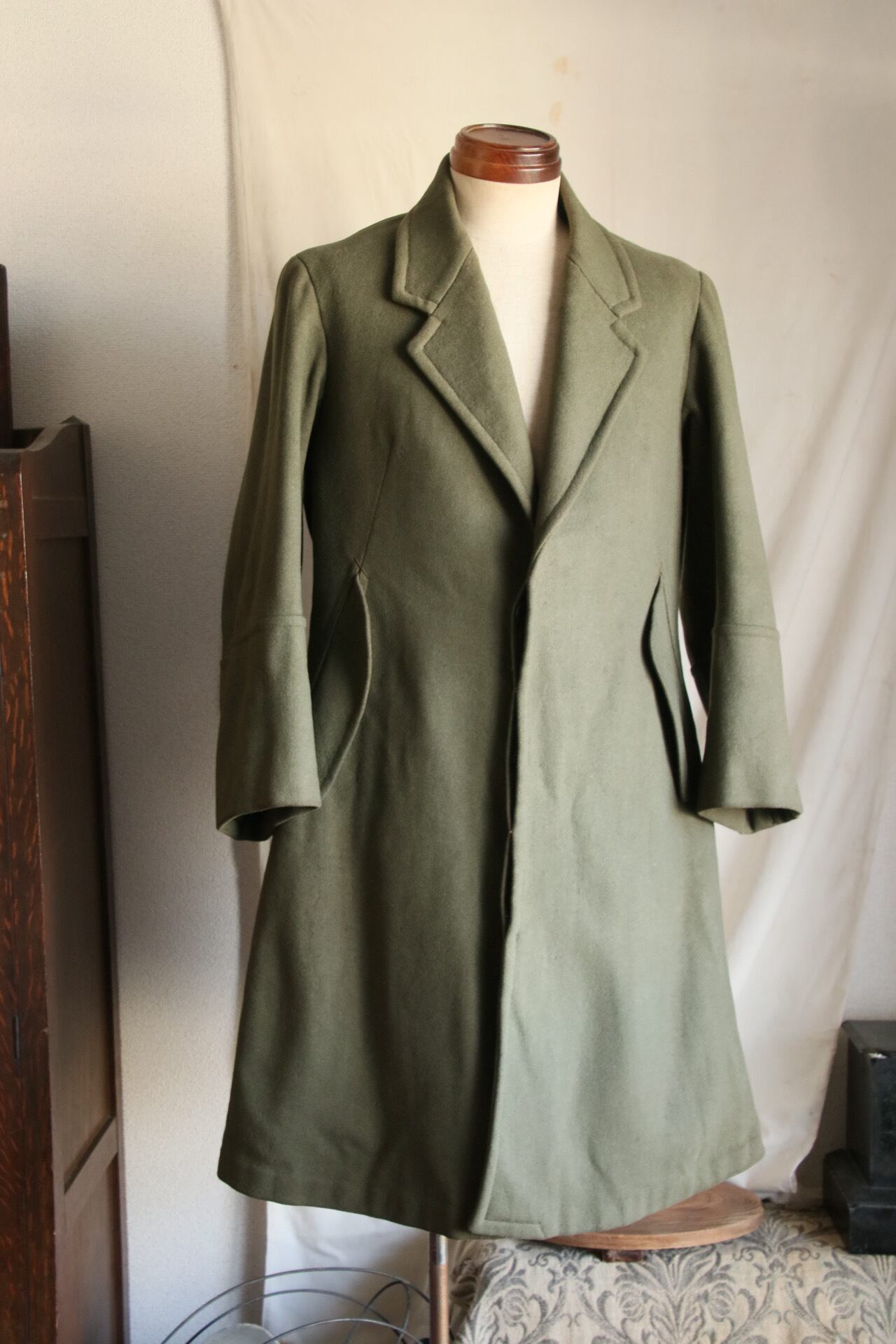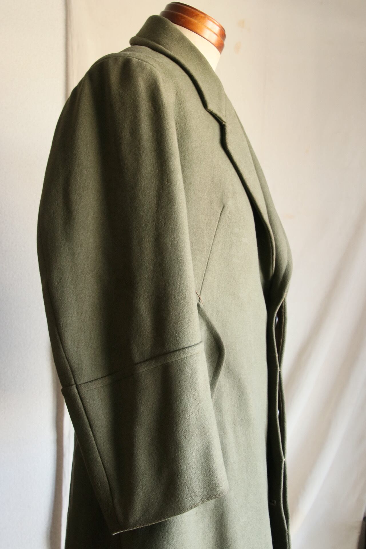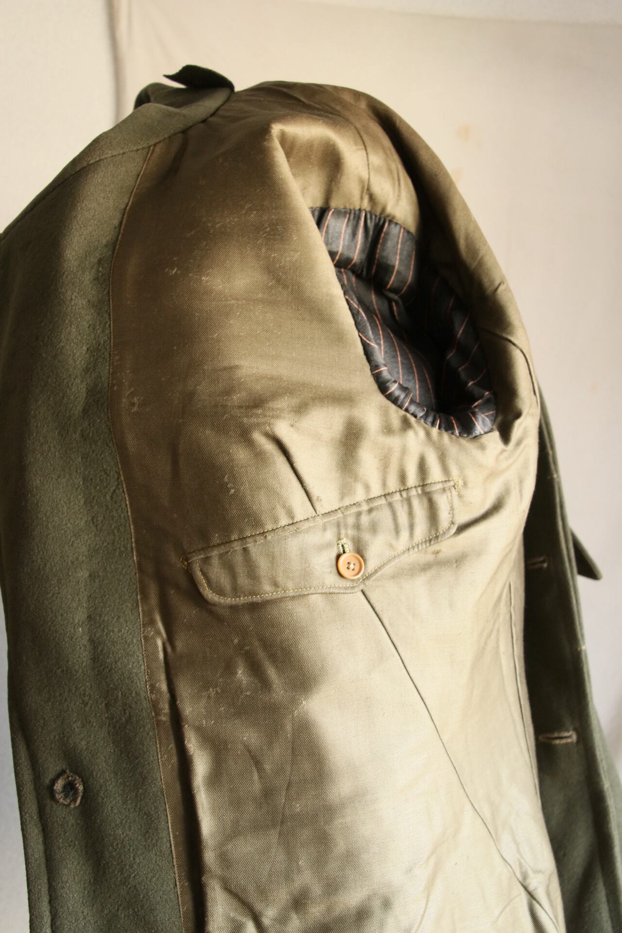 立体的な造型が美しいウールコート。昭和初期のものと推察しています。厚手の上質なウールでつくられており、ラペルの太いパイピング、斜めについたポケット、大ぶりの袖口など各種ディテールも充実。