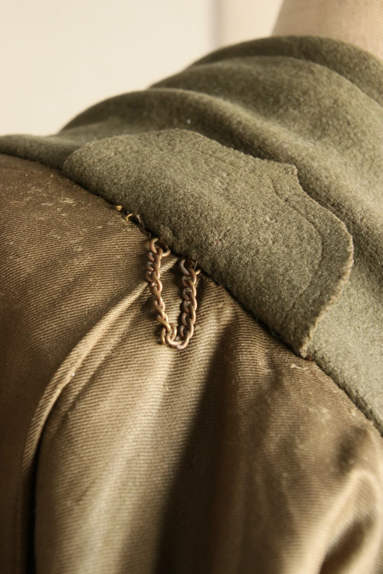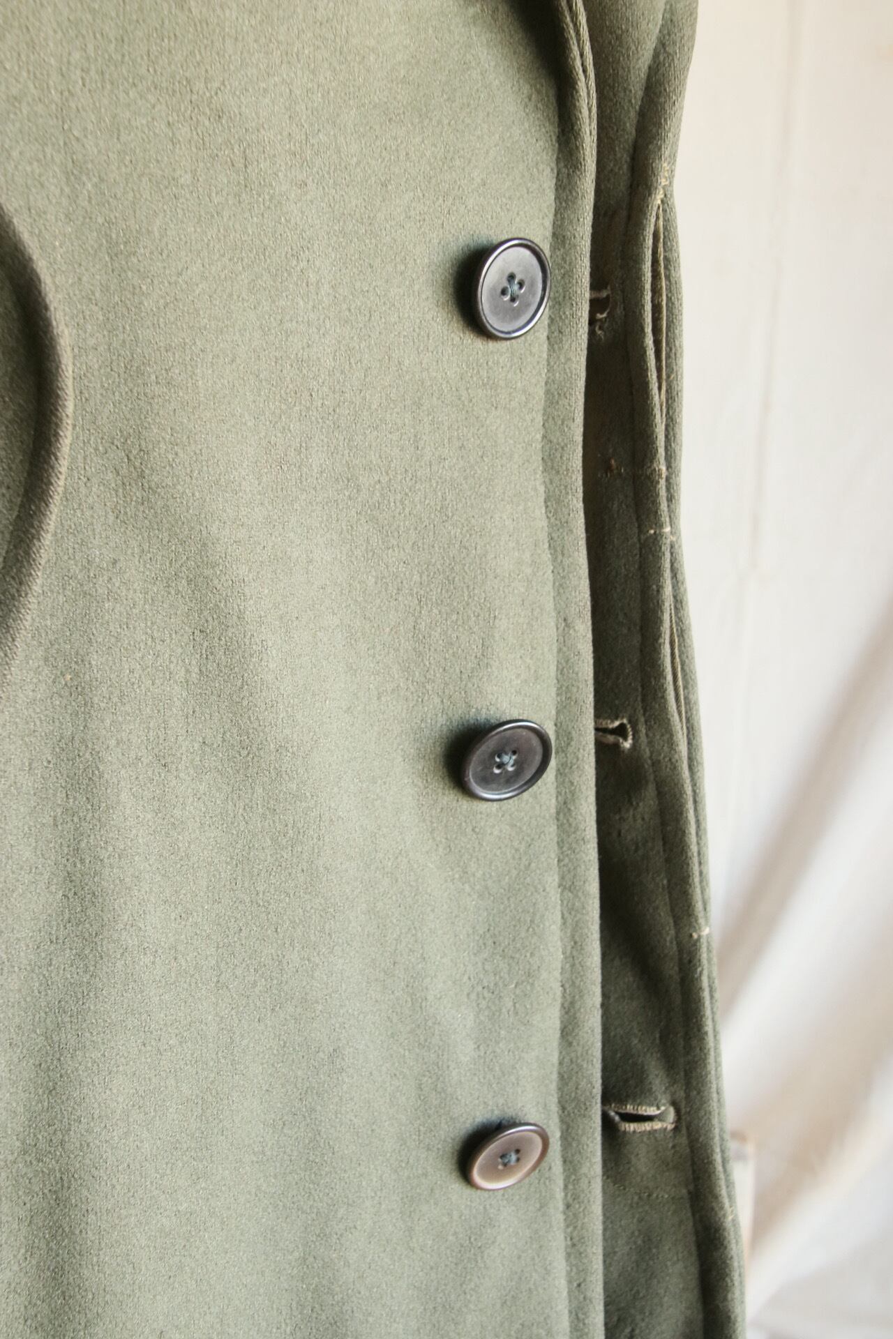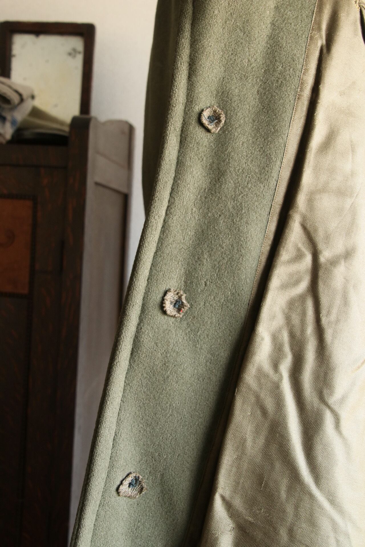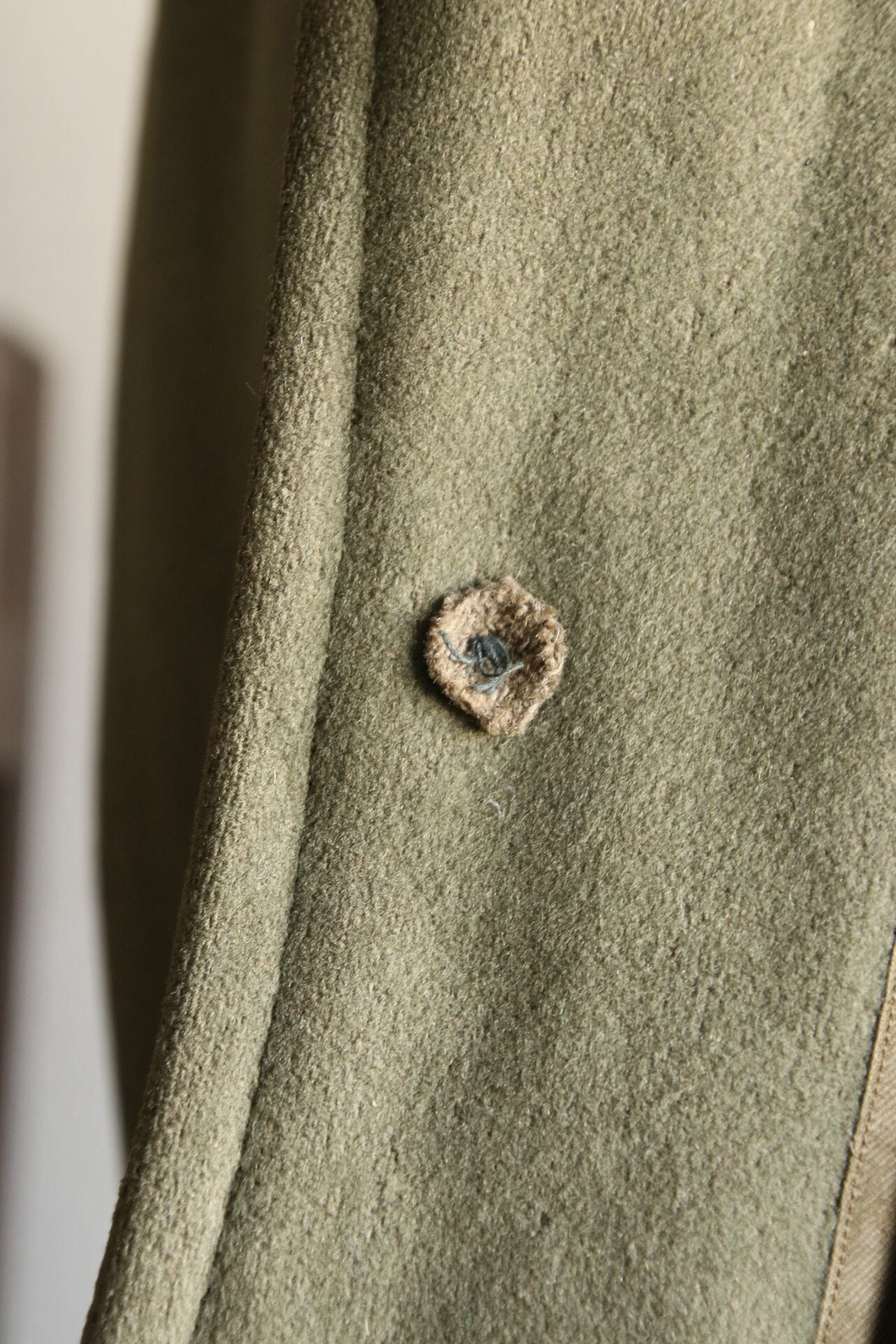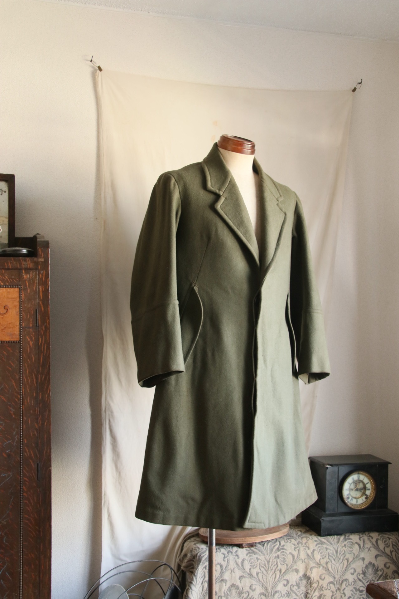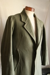 立体的な造型が美しいウールコート。昭和初期のものと推察しています。厚手の上質なウールでつくられており、ラペルの太いパイピング、斜めについたポケット、大ぶりの袖口など各種ディテールも充実。
