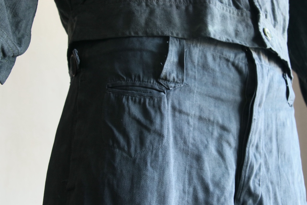 石や骨製のボタンが採用されている古い仕様。パンツにはサイドアジャスターが備えられているのでウエストの調整も柔軟に。