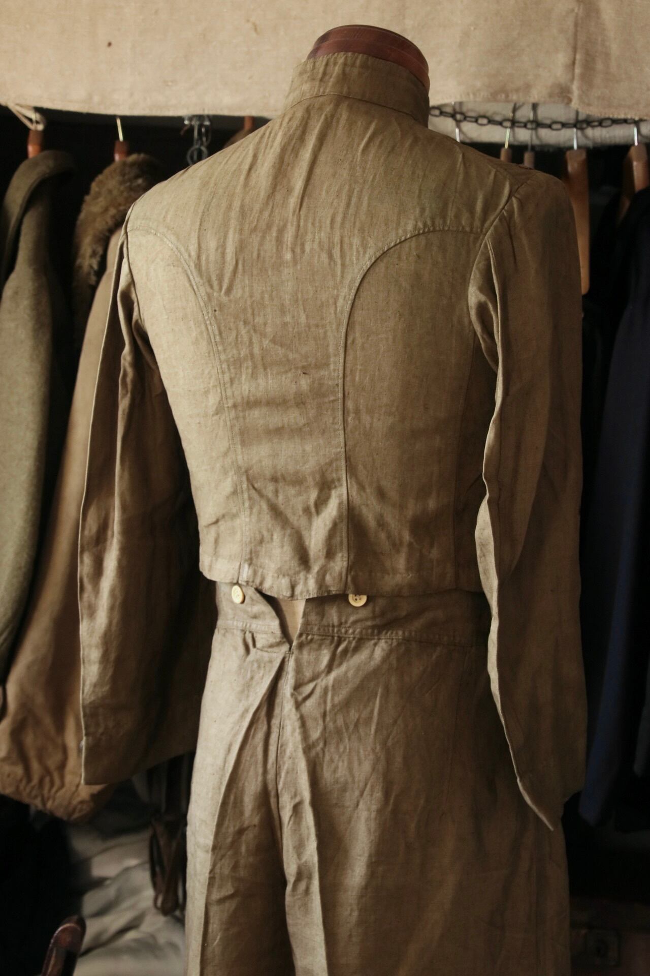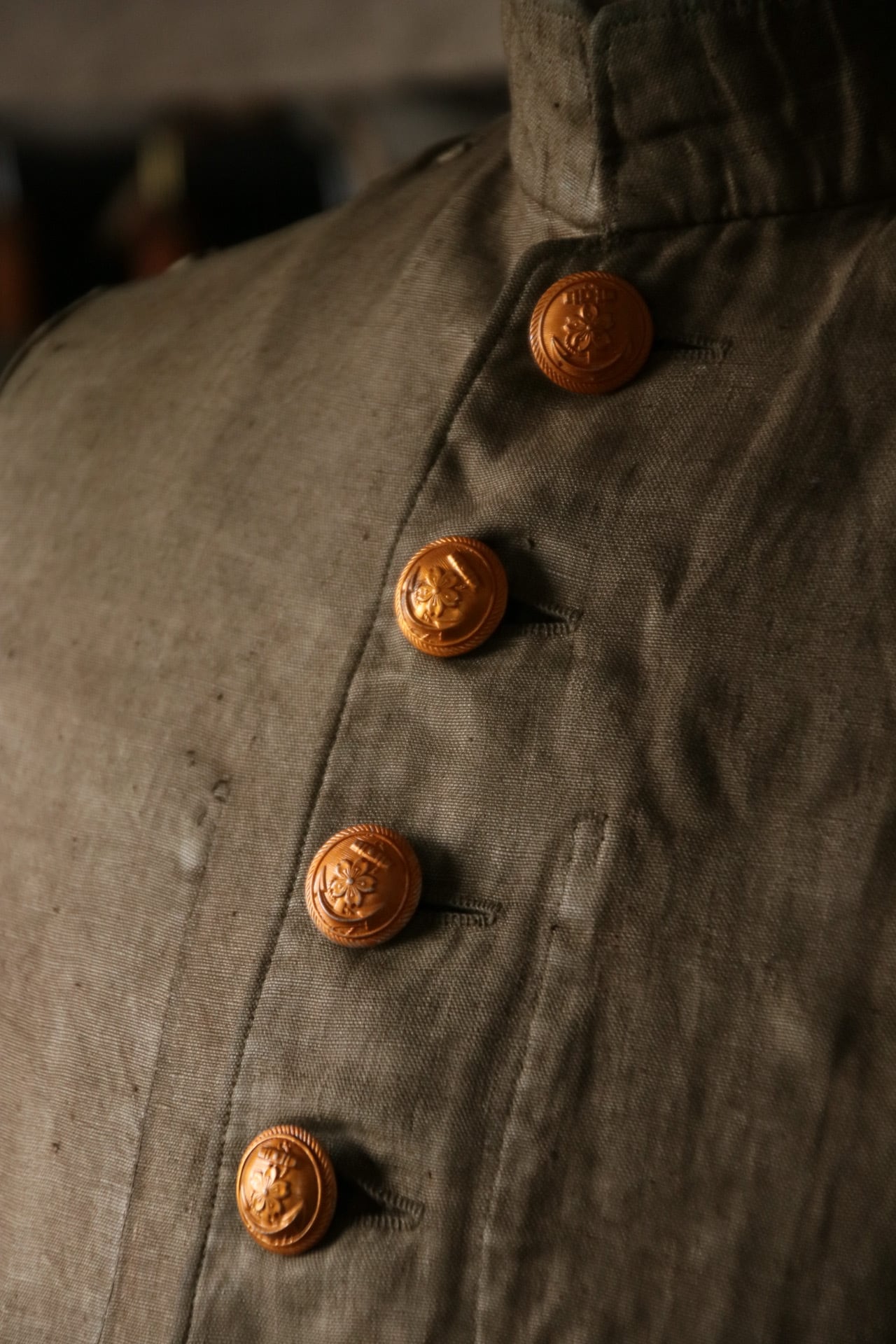 昭和19(1944)年に発せられた「海軍三種軍装令」。一種の紺、二種の白に続いて臨時特例が出され、白を褐青色に丸染めされたもの。その後終戦を迎えるまでのおよそ1年間のみ作られた貴重な逸品です。