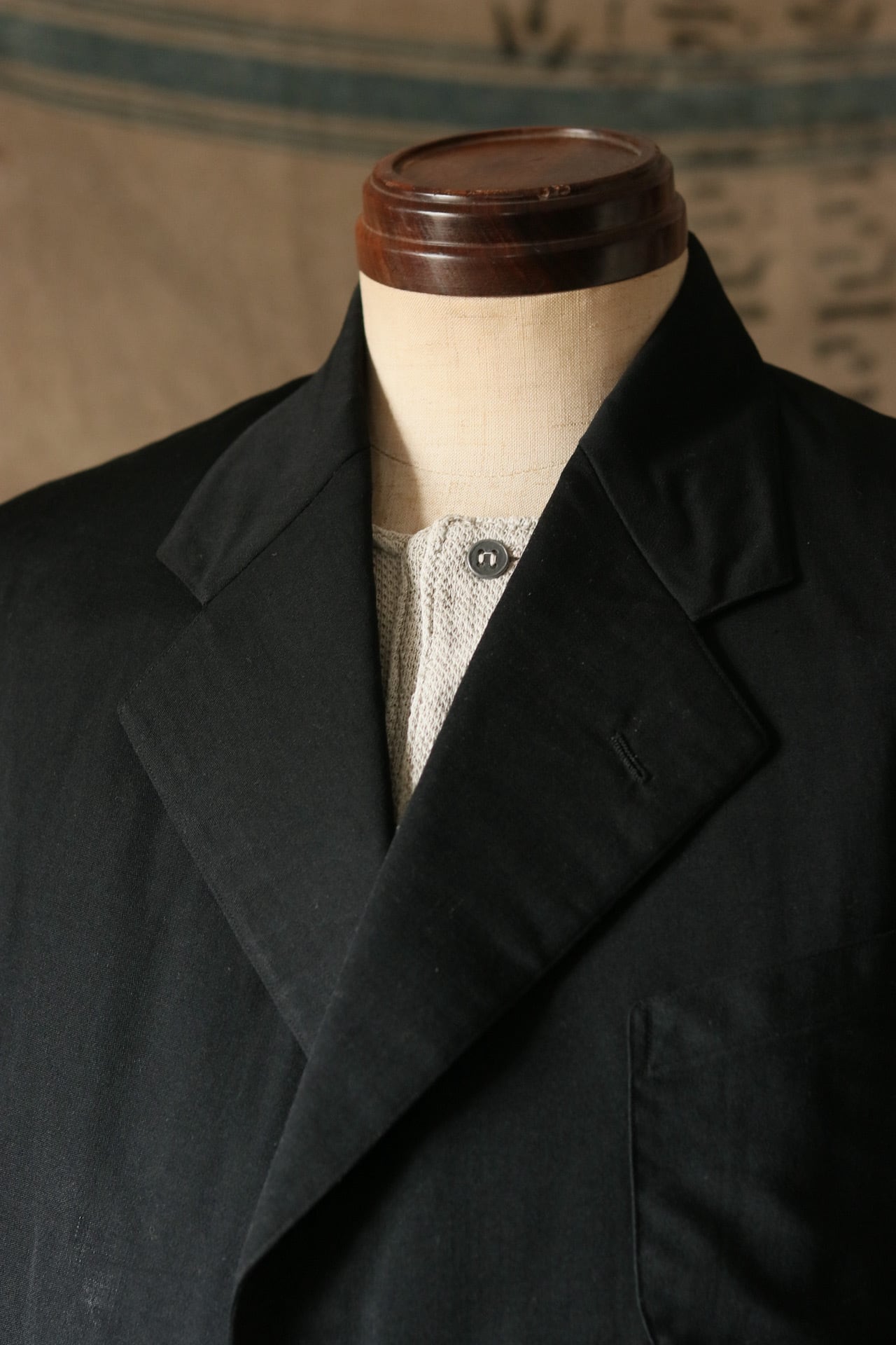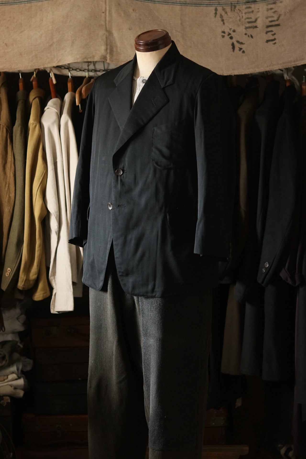 古い時代、昭和初期ごろのサックジャケット。一見すると普通のスーツのようですが、立体感のある襟、丸みのあるポケット、流線型のシルエットなど、かつての職人技が詰め込まれた一着。デッドストックの綺麗な状態です。