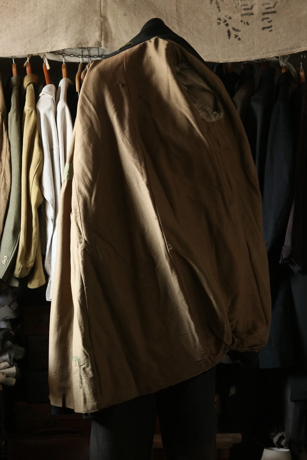 戦前の古いコート。ポケットの形は同年代のマントを想起させ、襟裏やボタン裏などに改造の痕跡があることから、年月をかけて再構築されてきたものだと推察します。