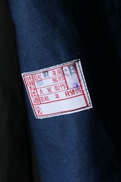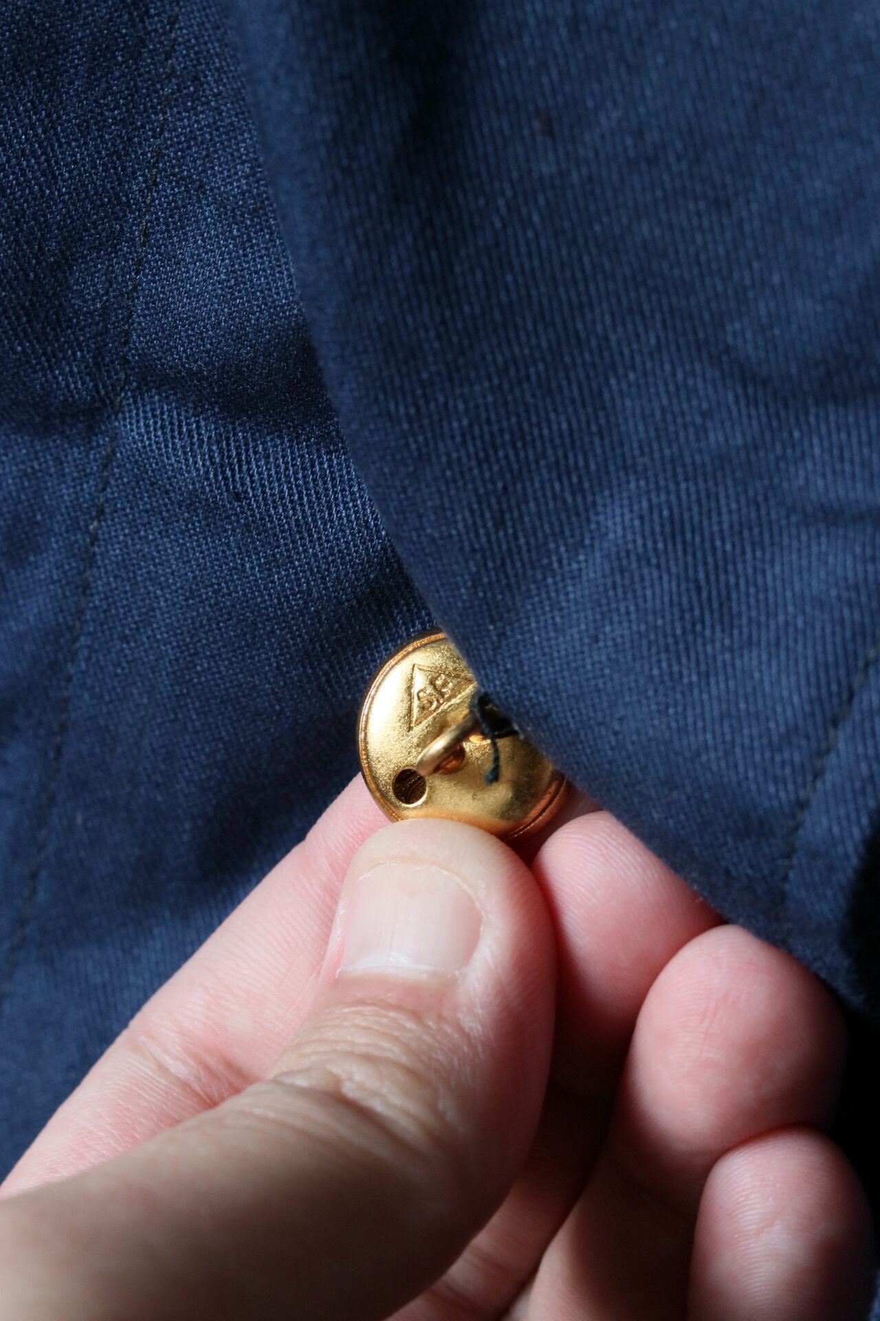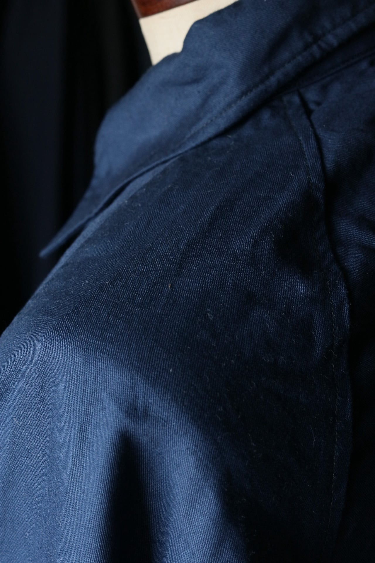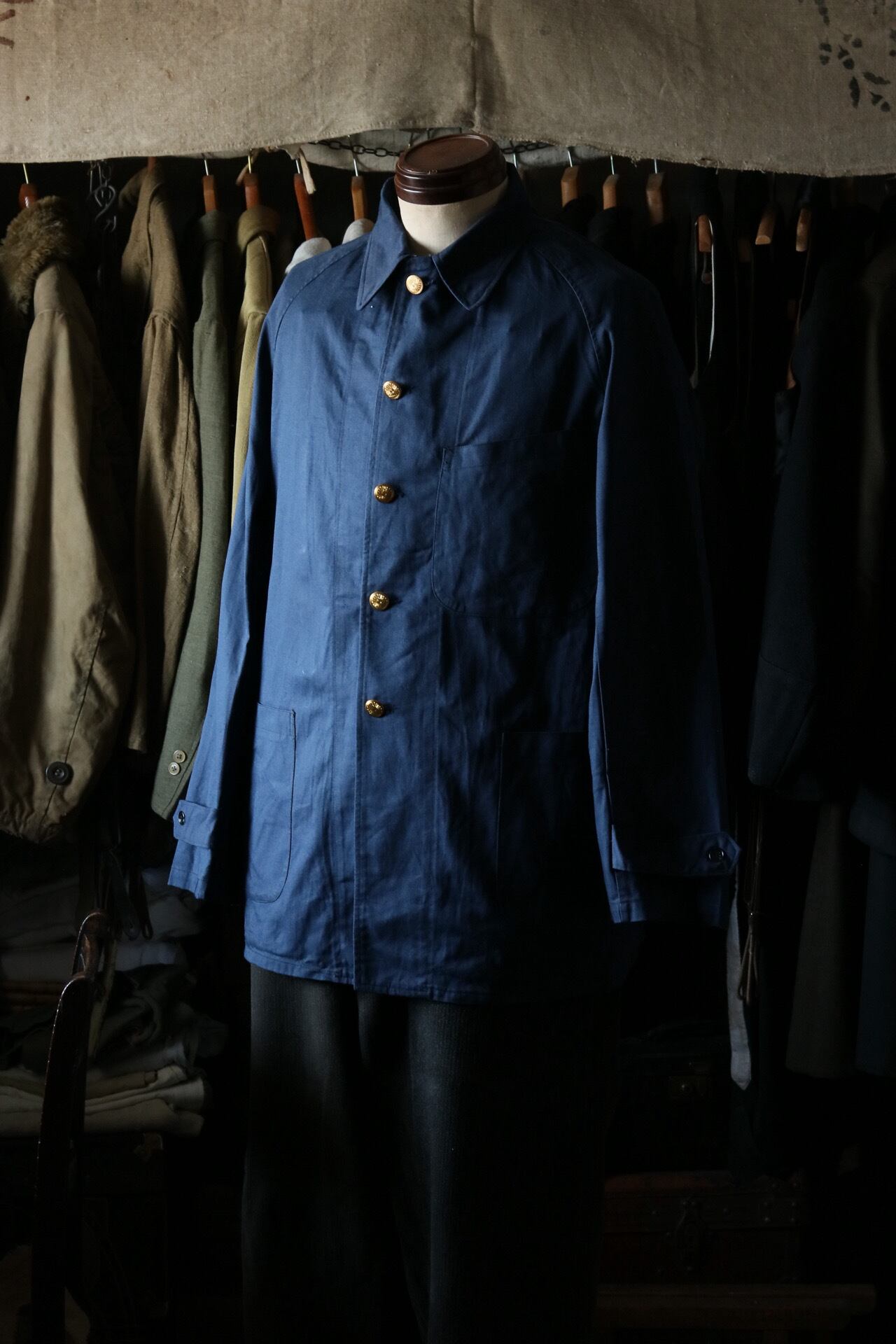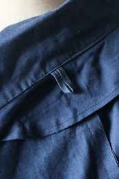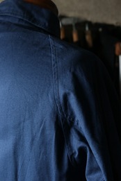 深い青に金ボタンがよく映えます。肩もラグラン仕様で男女ともにお召しいただきやすいサイズ感。