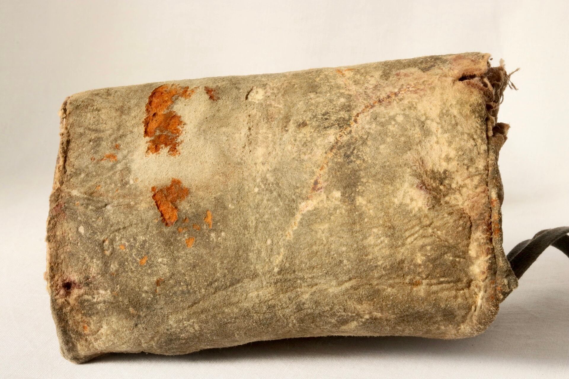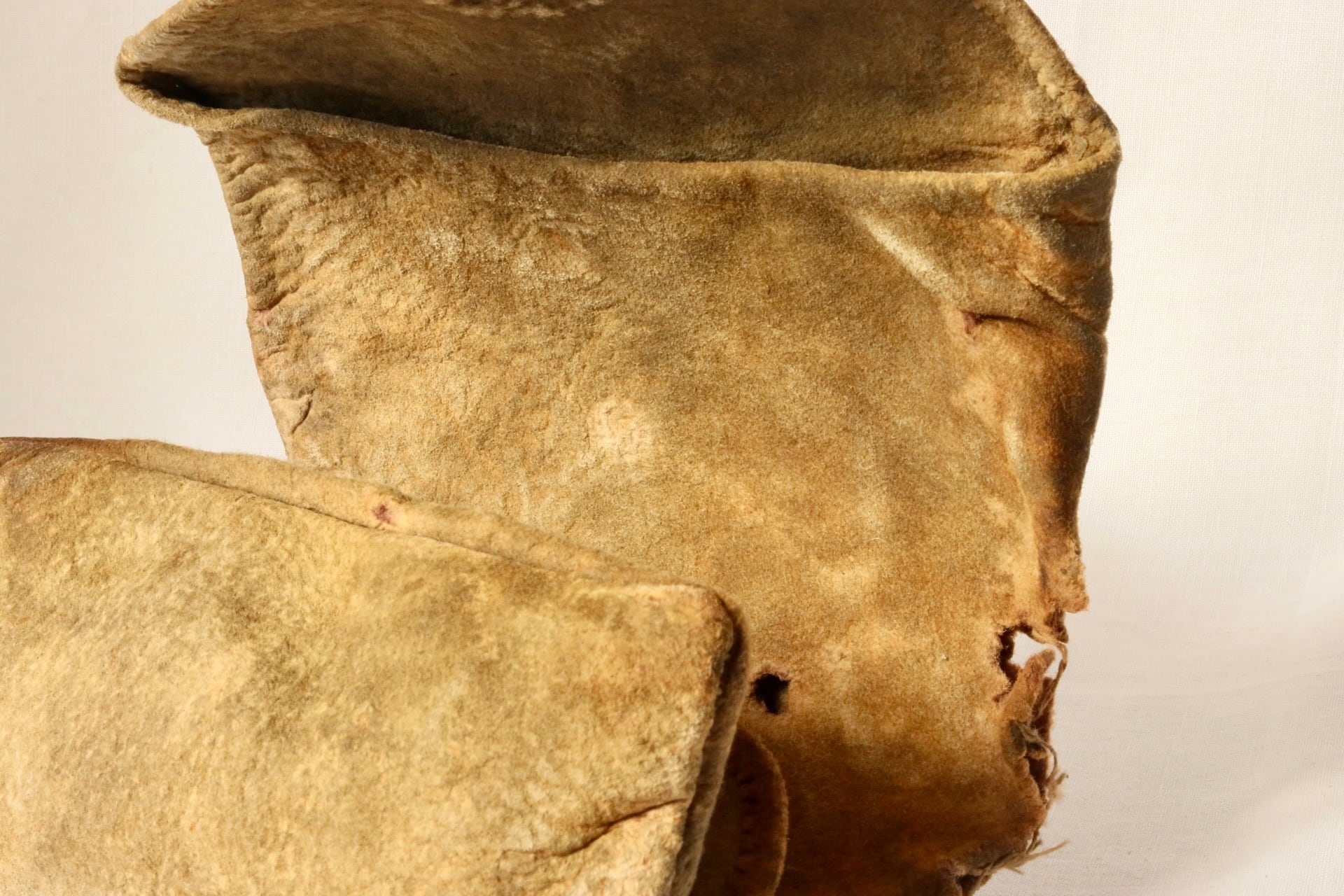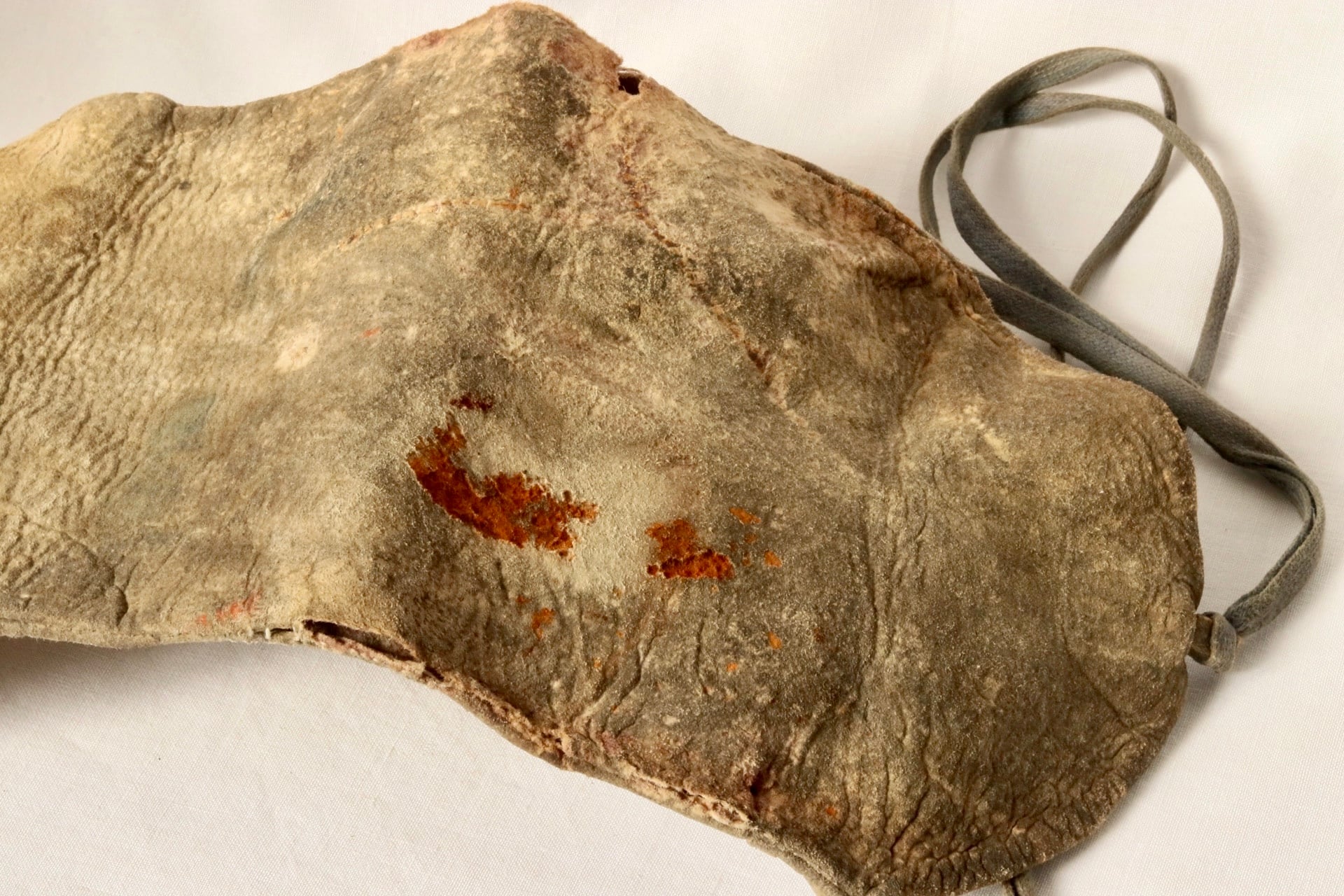 素材はおそらく鹿の革だと思われます。日本の古道具にはよく使われている印象。