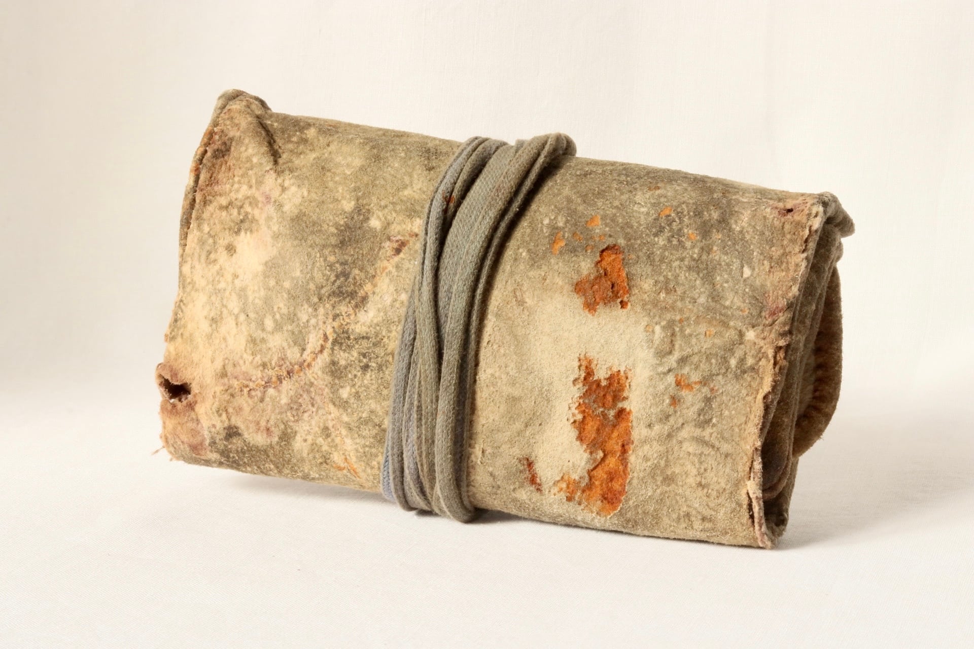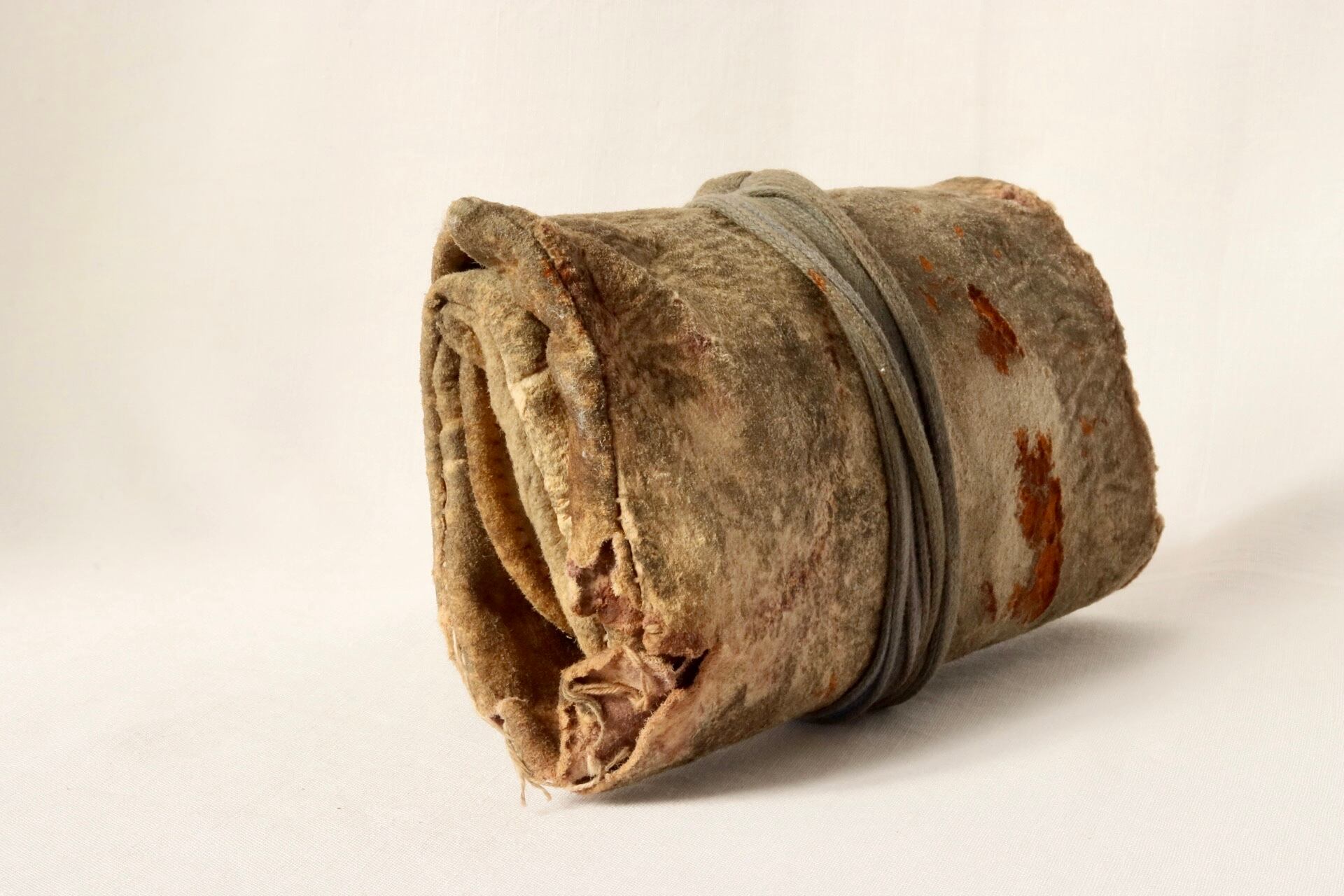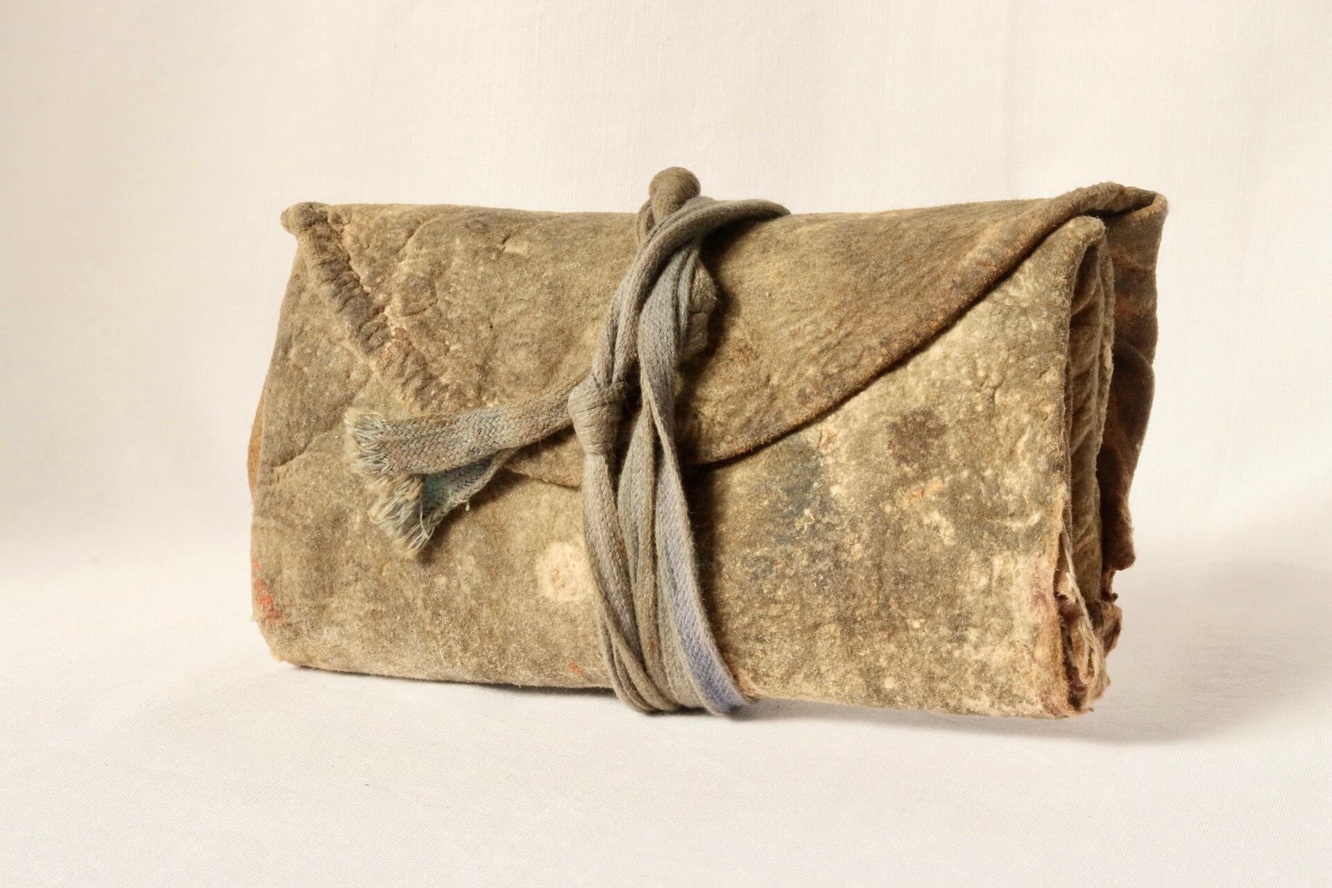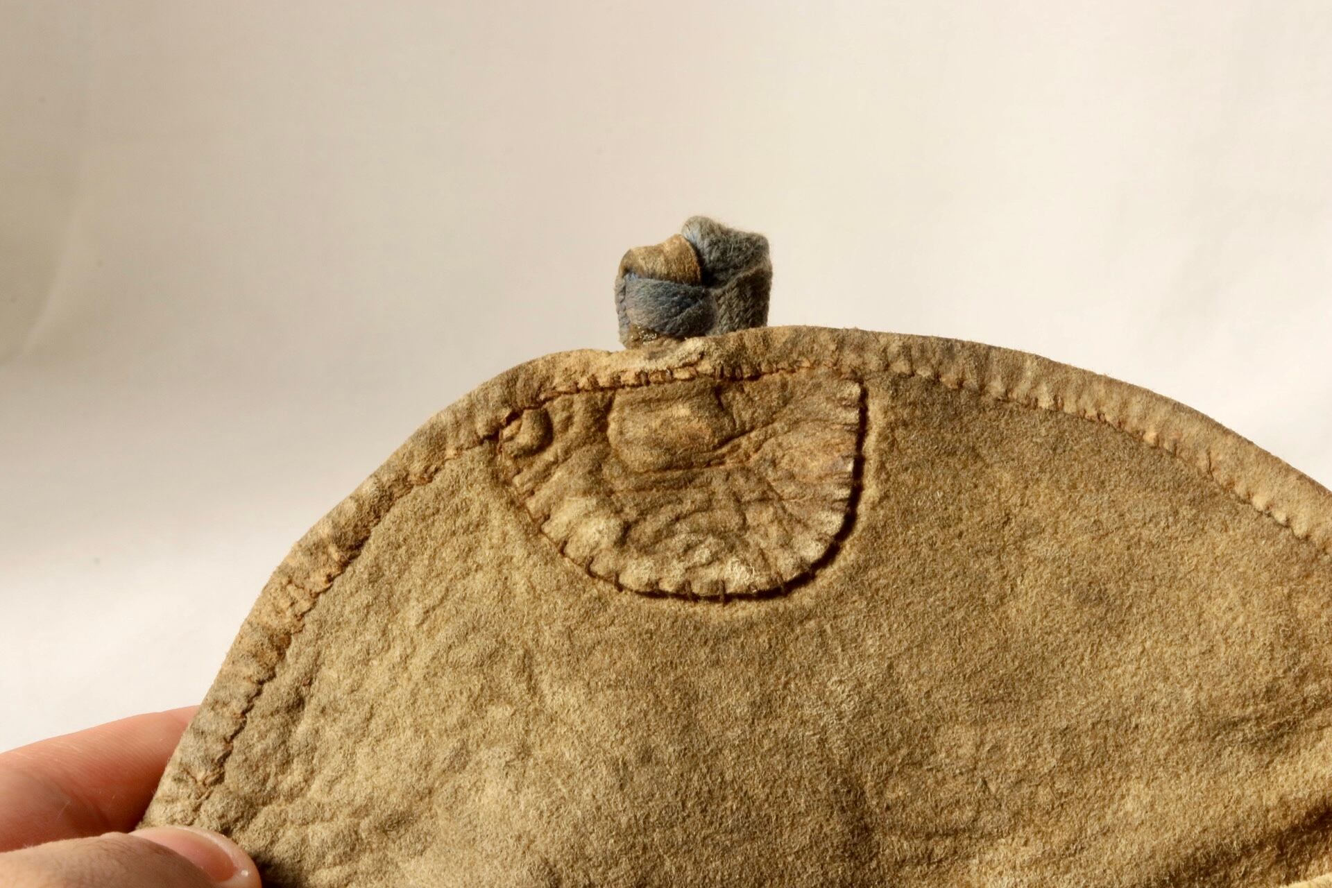 縦長の袋をパタパタと折り畳み、紐(これもまた味わいのある)でくるくると巻き留める仕様。革の表面は和紙を触っている時のような、さらさら、ふわふわした触感です。